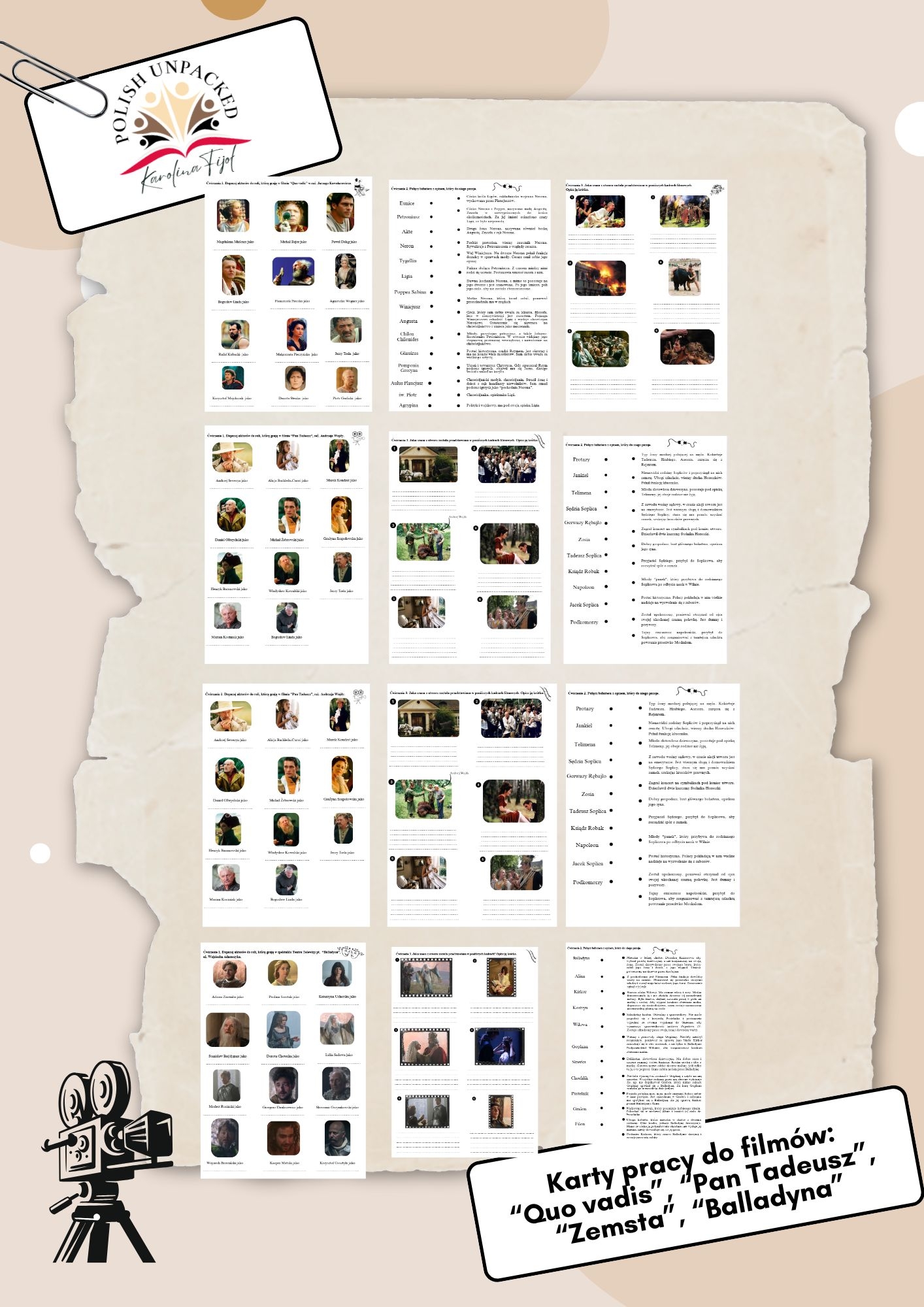 🎬🎭 Pakiet 4 kart pracy – lektury w filmie i teatrze „Zemsta”, „Quo vadis”, „Balladyna”, „Pan Tadeusz” Ten zestaw to komplet gotowych kart pracy, które łączą lektury obowiązkowe z ich adaptacjami filmowymi i teatralnymi. Idealny dla nauczycieli i uczniów przygotowujących się do egzaminu ósmoklasisty. ✨ Co zyskujesz dzięki pakietowi: 🎭 uczniowie utrwalają bohaterów, dopasowując aktorów do ról, 📖 ćwiczą rozpoznawanie postaci i ich cech, pracując z opisami, 🎬 uczą się opisywać sceny na podstawie kadrów, ✍️ rozwijają umiejętność tworzenia spójnych wypowiedzi, zgodnie z wymaganiami egzaminacyjnymi. 📌 W skład zestawu wchodzą karty pracy do: ✔️ „Zemsty” (film, reż. Andrzej Wajda) ✔️ „Quo vadis” (film, reż. Jerzy Kawalerowicz) ✔️ „Balladyny” (spektakl Teatru Telewizji) ✔️ „Pana Tadeusza” (film, reż. Andrzej Wajda) 📎 Zestaw zawiera: ✅ puste karty pracy dla uczniów, ✅ gotowe odpowiedzi – oszczędność czasu i wygoda sprawdzania. Pakiet idealnie sprawdzi się na lekcji, podczas powtórek, jako praca domowa lub materiał do samodzielnej nauki. To praktyczne wsparcie nauczyciela i skuteczne przygotowanie uczniów do egzaminu 🎯