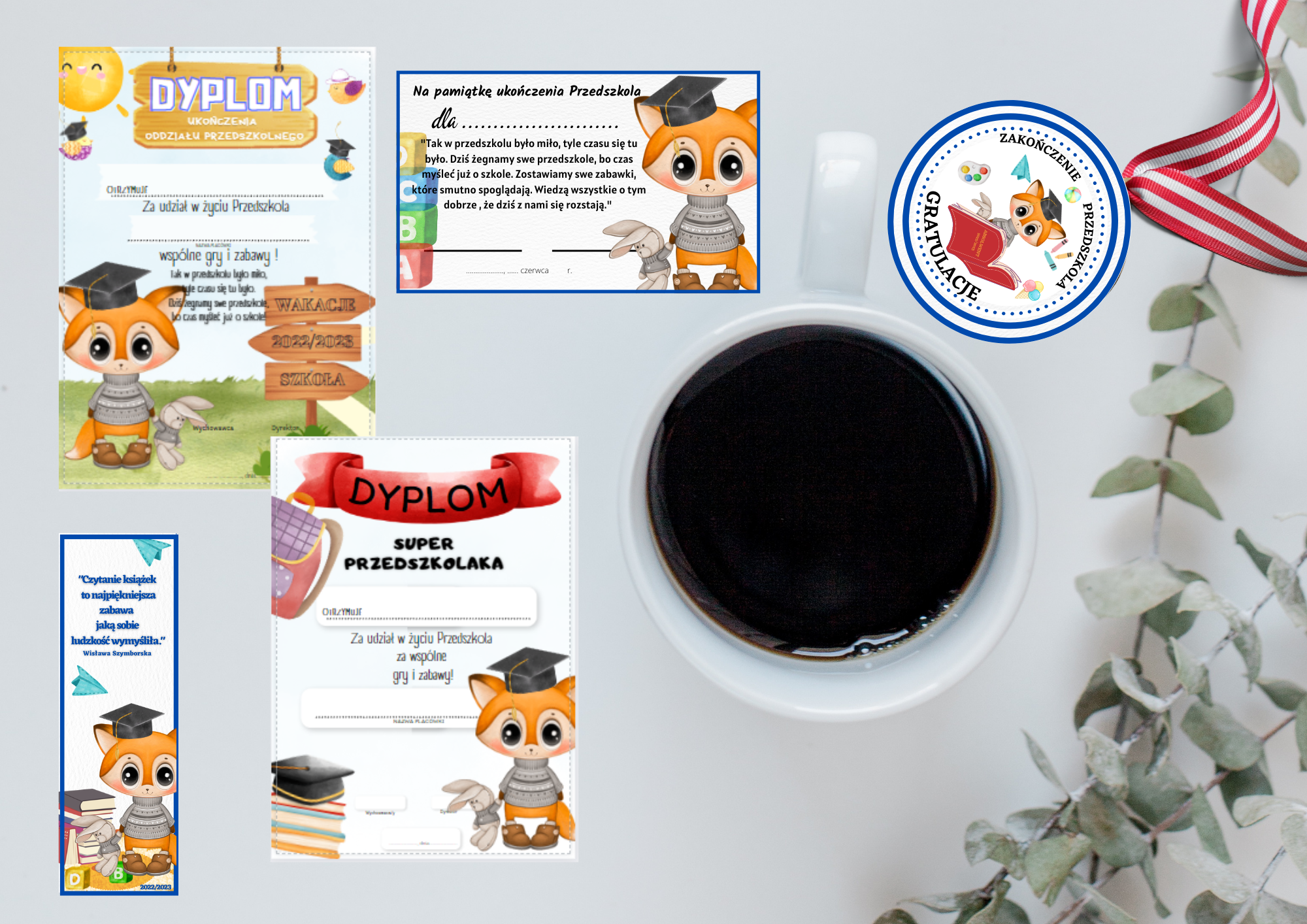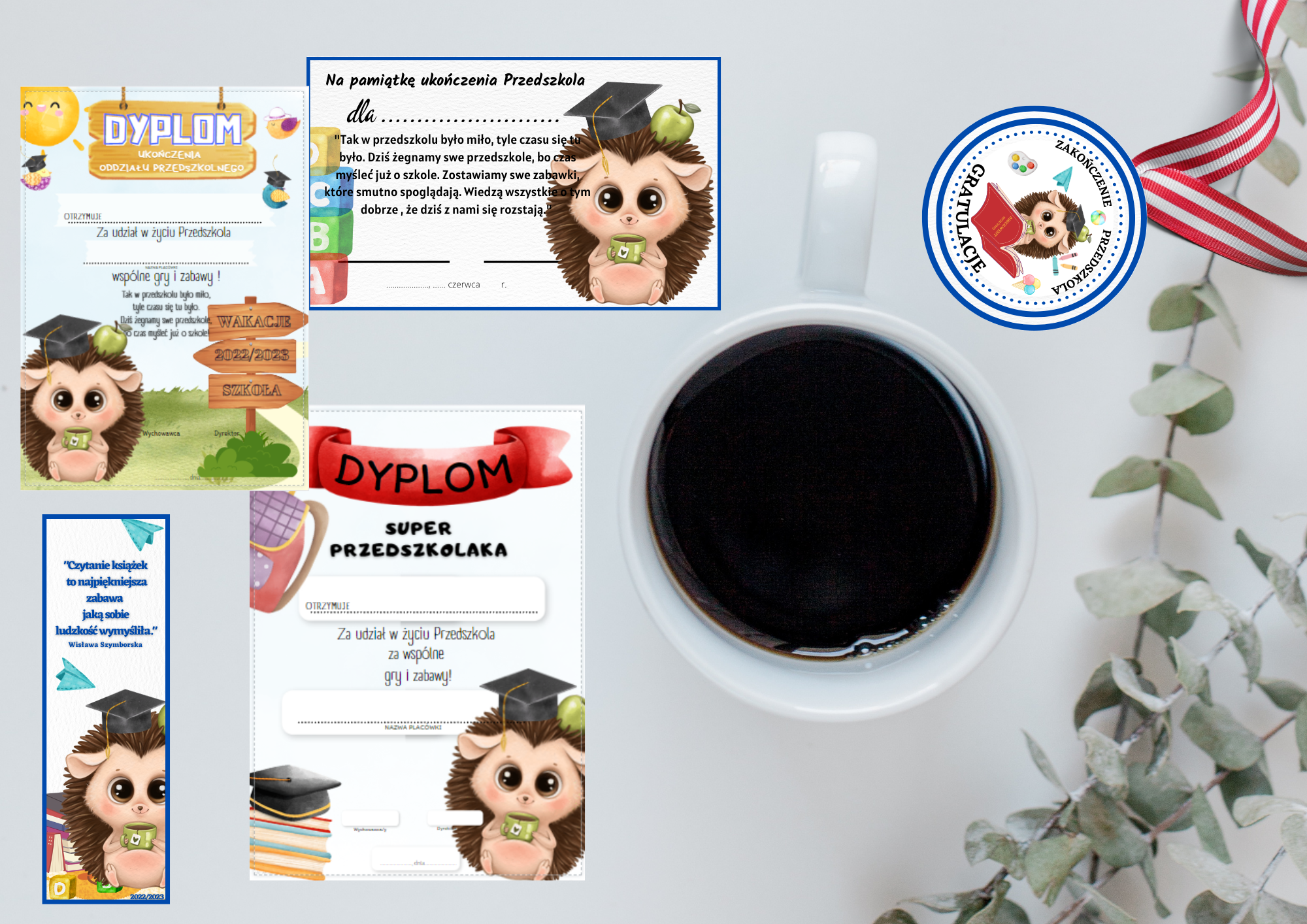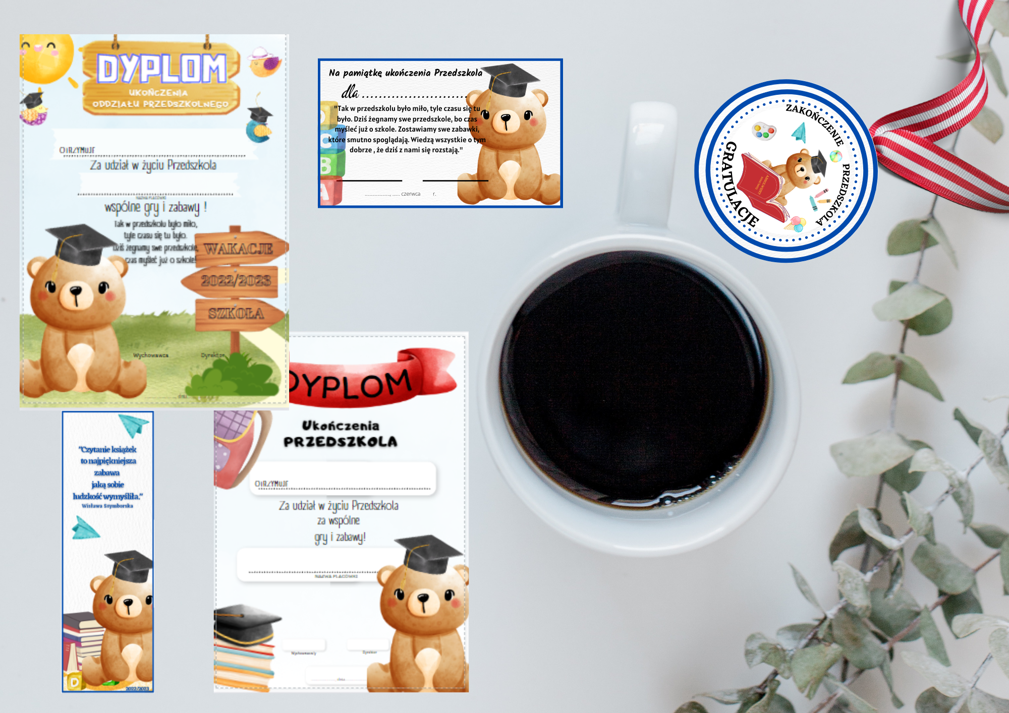 Pakiet zawiera 9 zestawów na zakończenie przedszkola wraz z życzeniami oraz innymi dyplomami na podziekowania. Łącznie to ponad 100 stron do wydruku!
