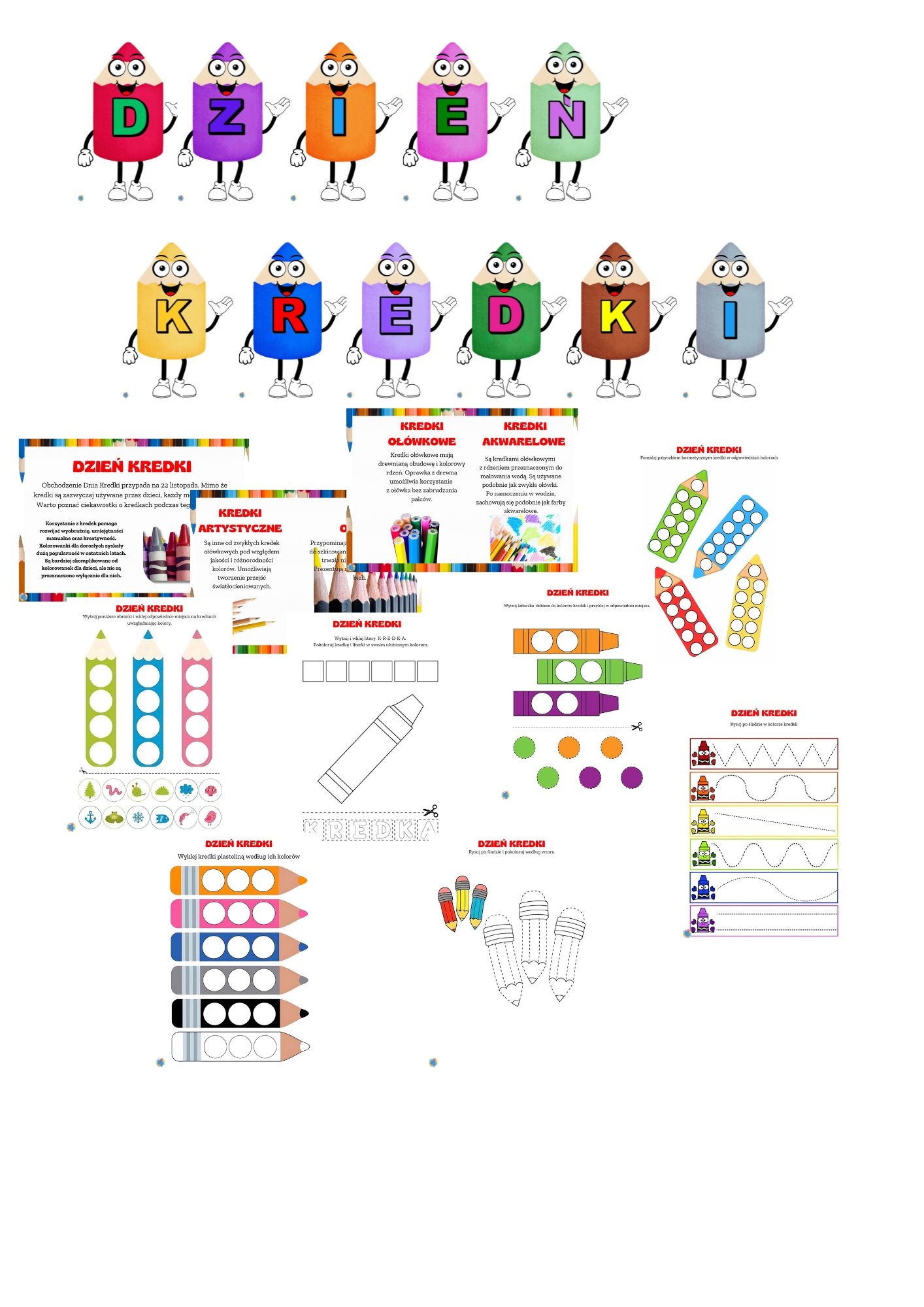 Dzień kredki to nietypowe święto, które przypada na 22 listopada. W pliku znajdziecie gazetkę o kredkach jak i również karty pracy, girlandę.
