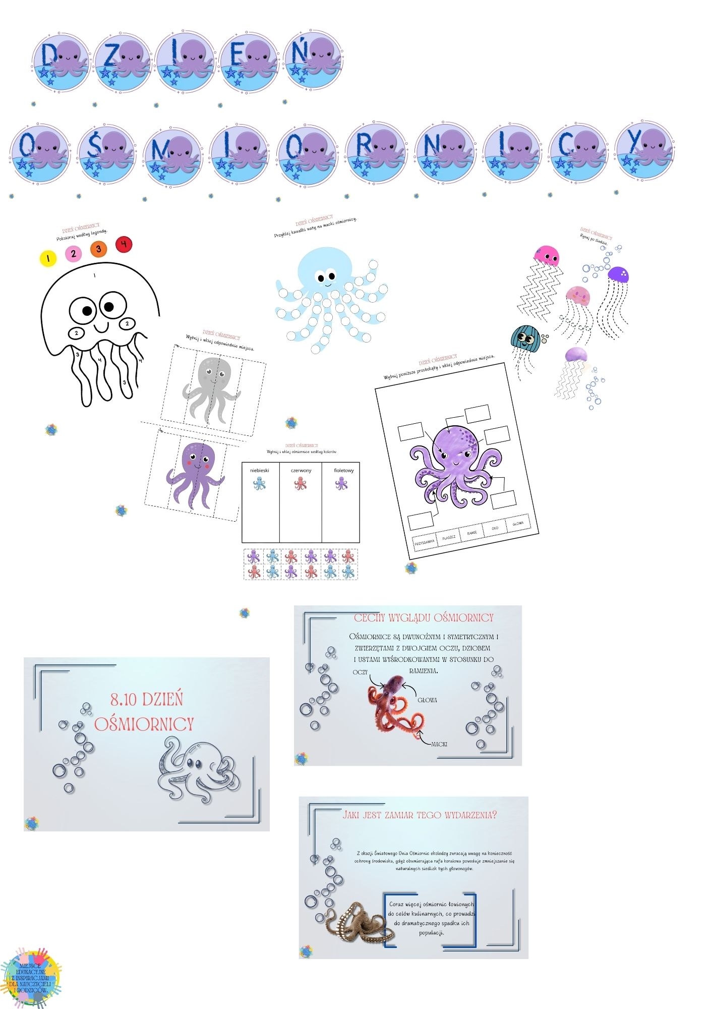 Z okazji przypadającego 8 października Światowego Dnia Ośmiornicy przygotowała gazetkę o ośmiornicy Gazetkę można wydrukować i zalaminować i powiesić. W pliku również możecie znaleźć kilka kart pracy oraz materiał na pracę plastyczną.