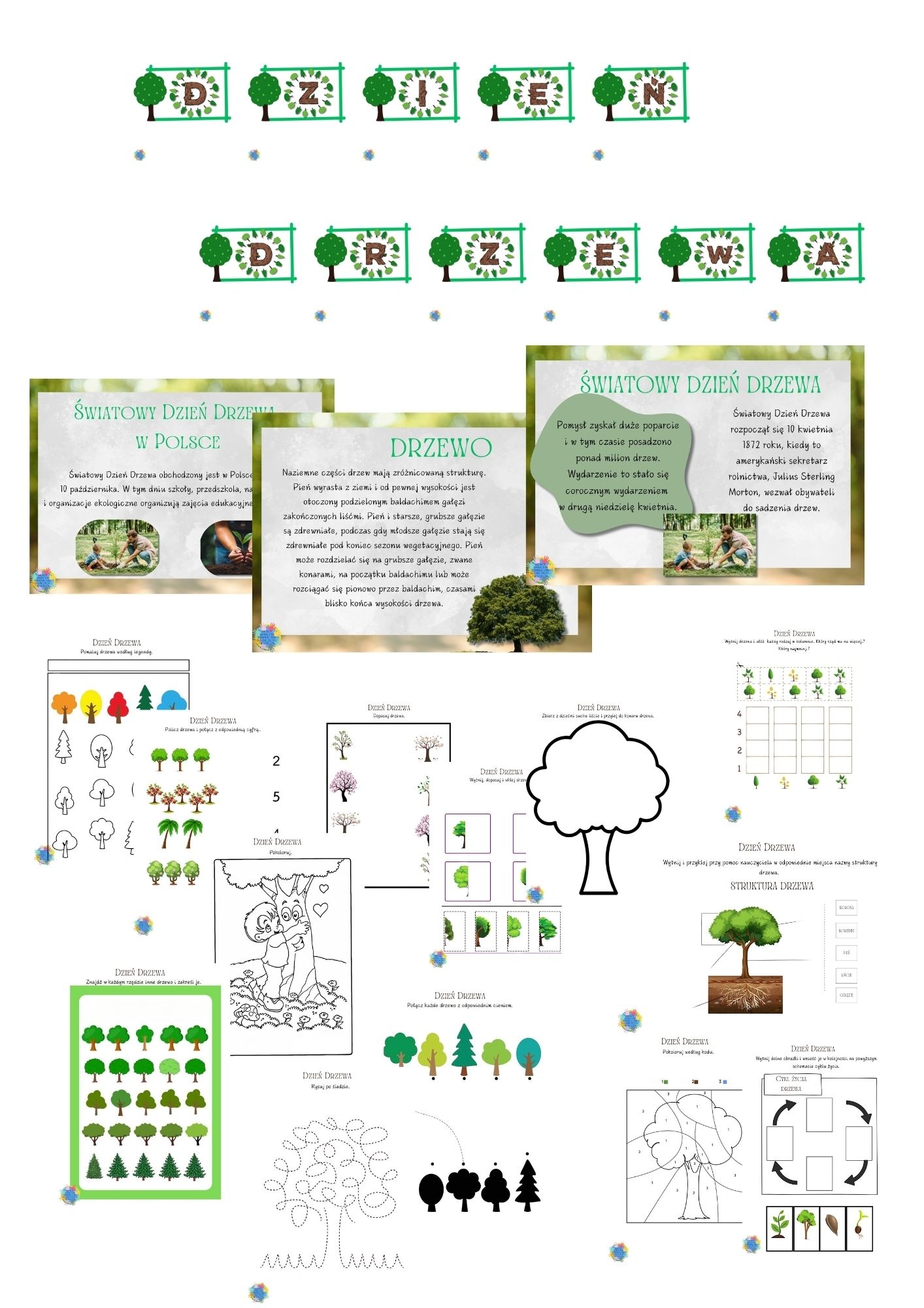 Z okazji przypadającego 10 października Światowego Dnia Drzewa przygotowałam gotowy do wydrukowania materiał do realizacji tego tematu. W pliku znajdziecie: gazetę do powieszenia na tablicy przedszkolnej - szkolnej a w niej schemat budowy drzewa, jakie korzyści przynoszą nam drzewa?, Co zapewniają drzewa zwierzętom?. A ponadto napis - Dzień Drzewa do powieszenia, karty pracy , ćwiczenia grafomotoryczne, matematyczne, rozwijanie motoryki małej oraz propozycje prac plastyczno - techniczne. Łącznie 80 stron.