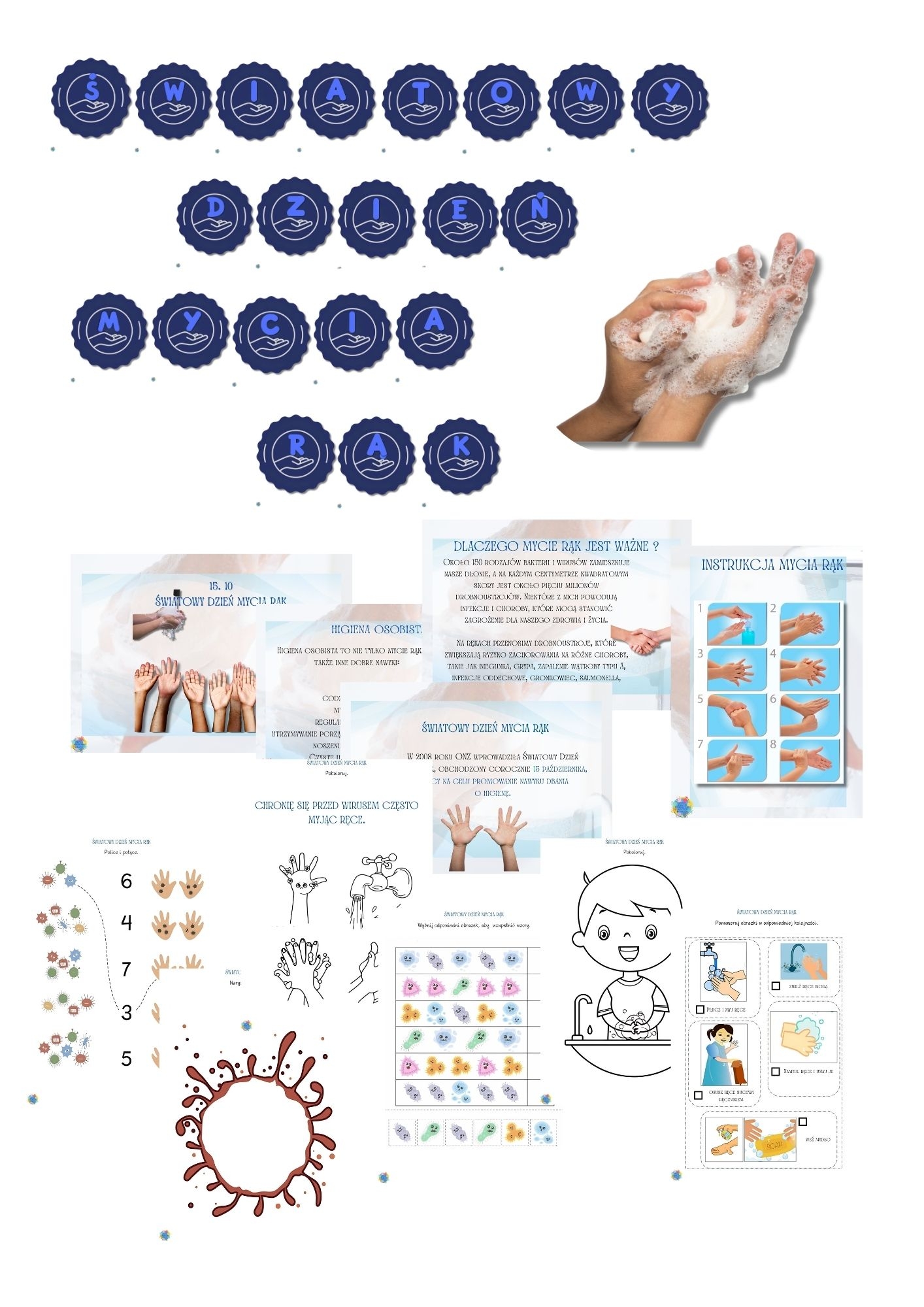 W związku z obchodzoną 15 października Światową Dniem Mycia Rąk, przygotowałam specjalny materiał, który, będzie pomocny w realizacji tego tematu. W pliku znajdziemy gazetkę na szkolną lub przedszkolną tablicę, kolorowanki, karty pracy - grafomotoryczne i matematyczne oraz girlandę do powieszenia i wiele innych przydatnych materiałów.