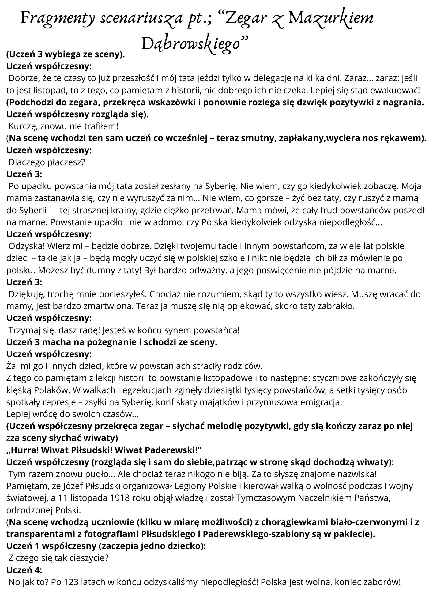 „Zegar z Mazurkiem Dąbrowskiego” to wzruszająca i jednocześnie przystępna inscenizacja, przygotowana specjalnie z myślą o szkolnych obchodach 11 listopada – Narodowego Święta Niepodległości.