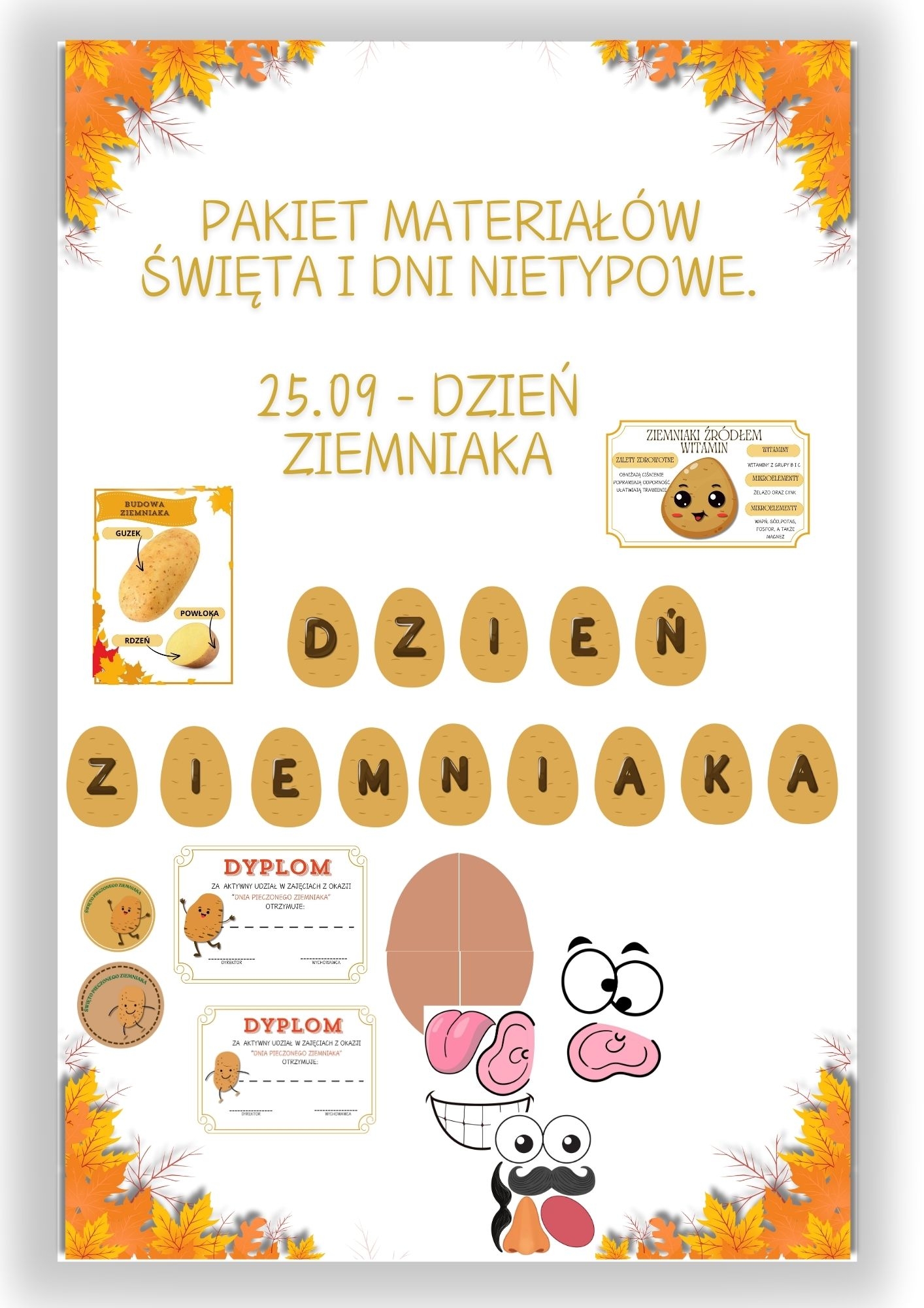 W zestawie znajdziemy również karty pracy, zabawy na festyn z tej okazji, historia ziemniaka - opowiadanie, girlanda, zabawa eksperymentalna, dyplomy, odznaki, figura ziemniaka do wspólnego złożenia z elementami.