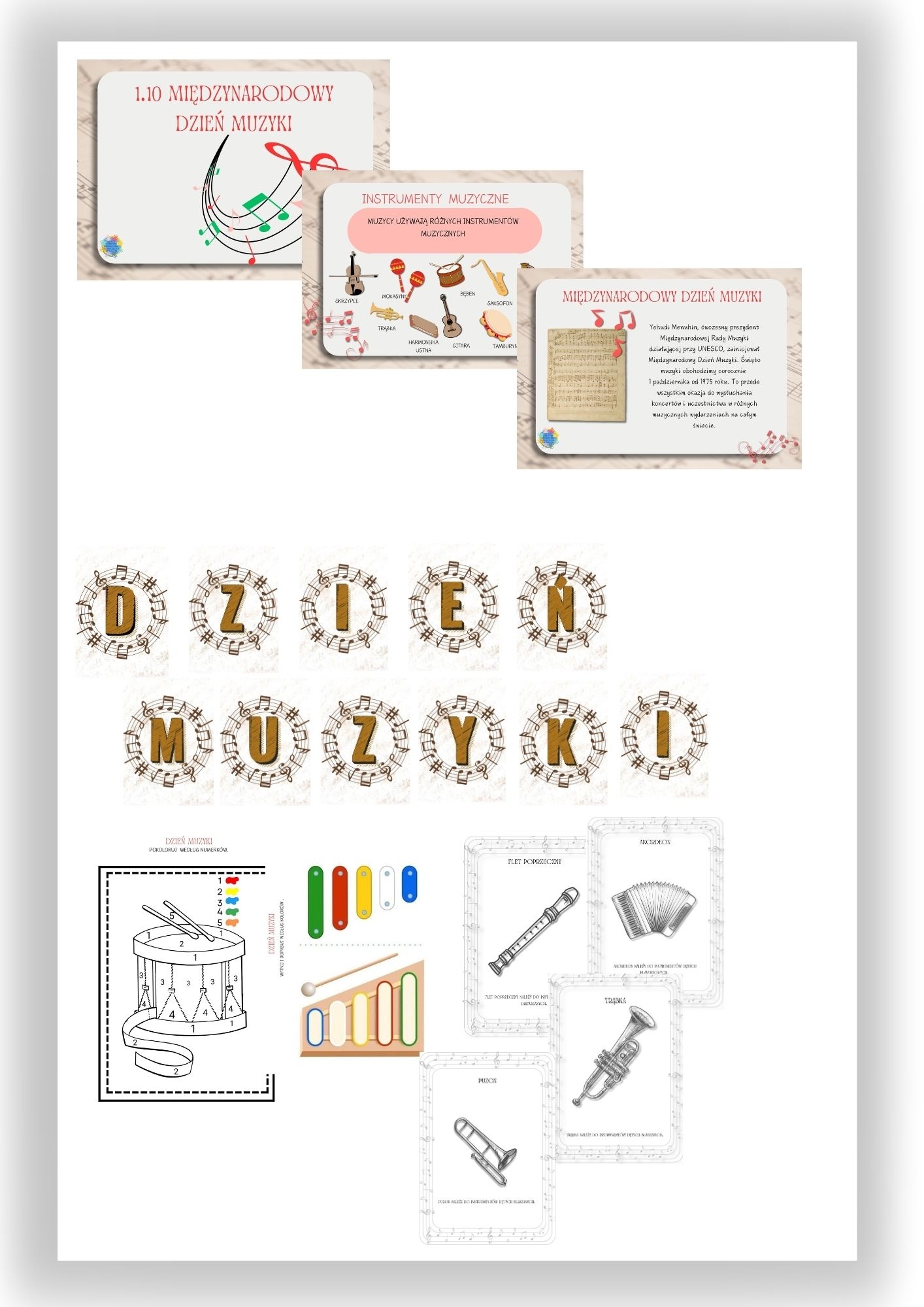 gazetkę do powieszenia, karty pracy, karty obrazkowe - instrumenty muzyczne, przykładowe prace plastyczne, które można wykorzystać do pracy z dziećmi oraz girlanda.