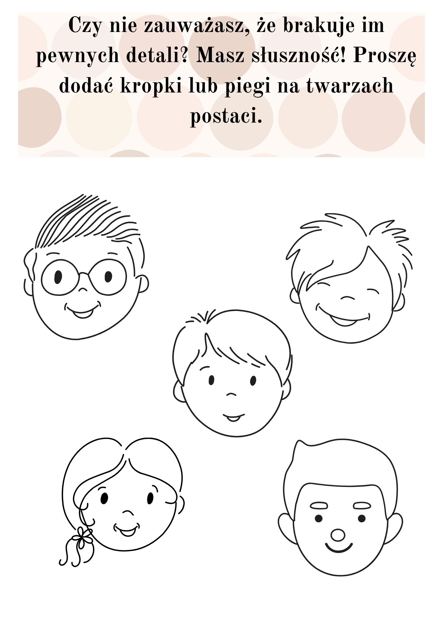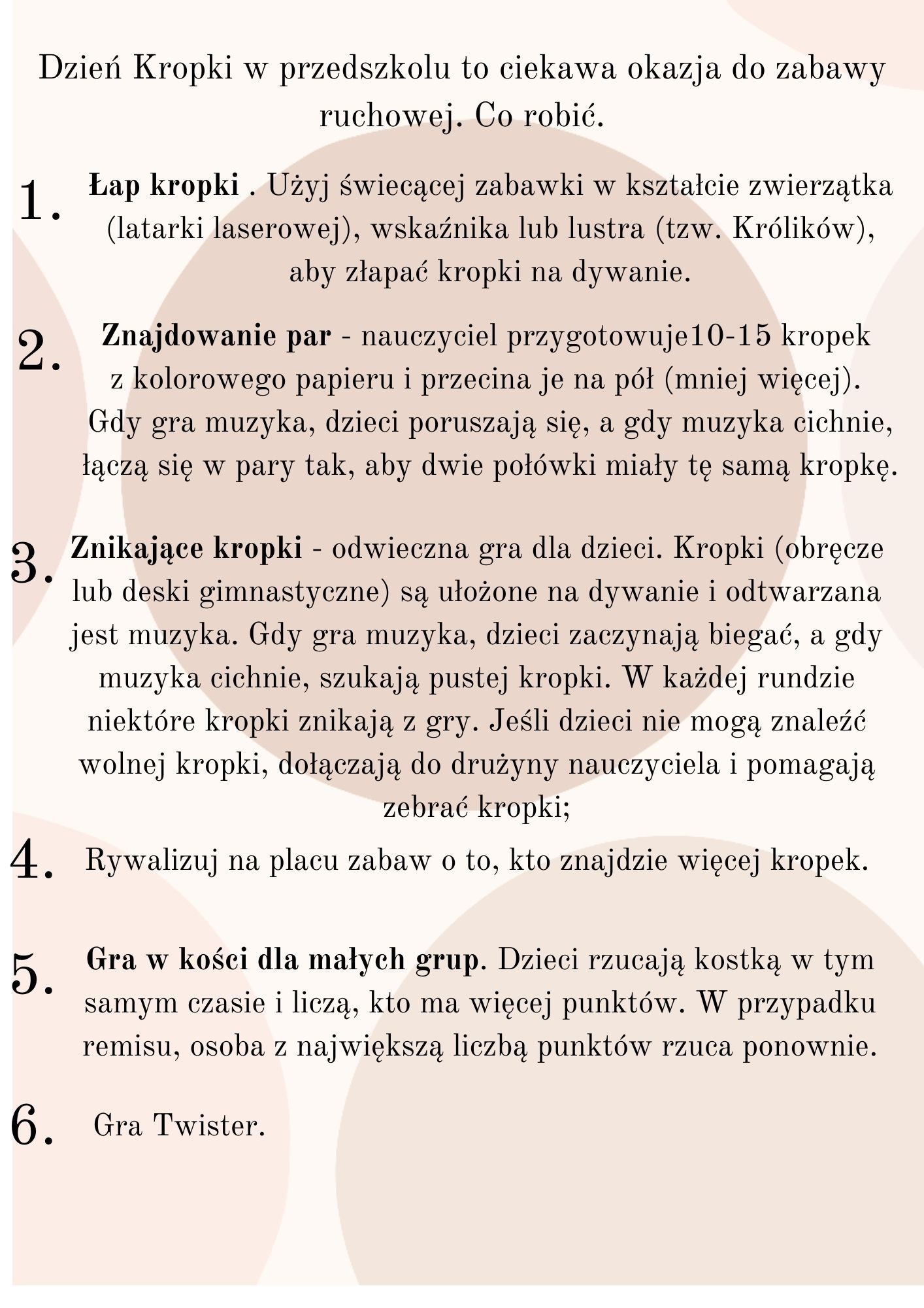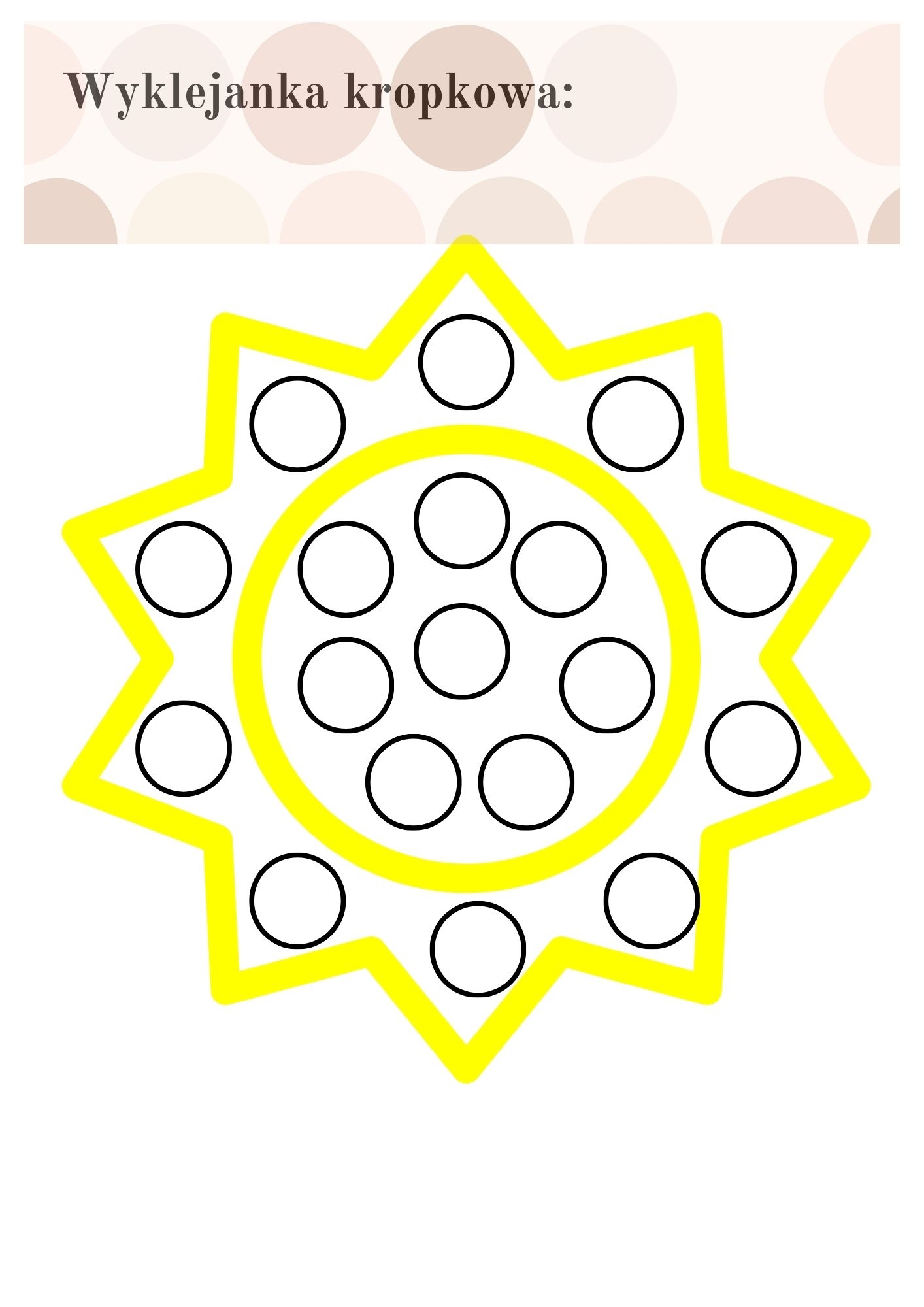 W pakiecie znajdziecie 26 zadań z kolorowymi kropkami do wycinania, rozwiązywania, rysowania, wyklejania i liczenia. Ponadto w zestawie znajdziecie girlandę oczywiście w kolorowe kropeczki, odznaka twórczego artysty ale także zabawy ruchowe, które możecie wykorzystać w sali przedszkolnej jak i na placu przedszkolnej.