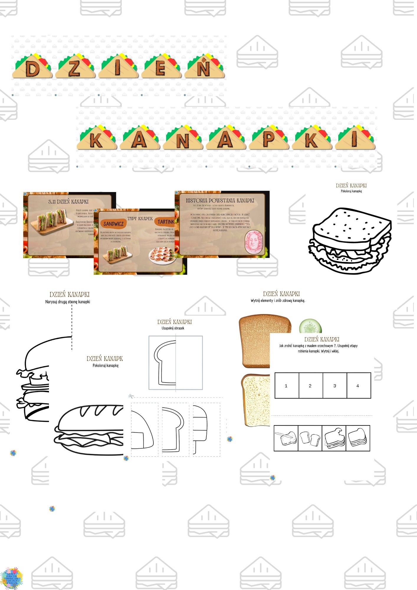 Dzień Kanapki, obchodzony co roku 3 listopada, jest okazją do uczczenia znanej i różnorodnej potrawy - kanapki. Z tej okazji przygotowałam materiał, który będzie pomocny w realizacji tego święta. W pliku znaleźć girlandę, gazetkę oraz kolorowanki.