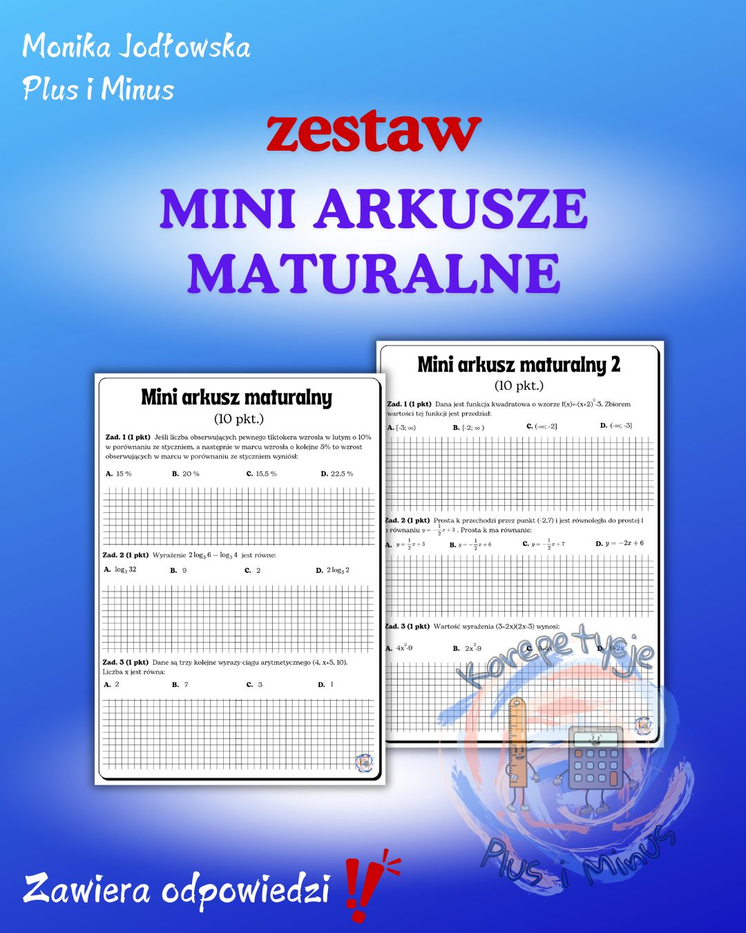 W pakiecie 2 autorskie mini arkusze maturalne z matematyki. Każdy z arkuszy na 10 punktów. Zestaw zawiera rozwiązania.