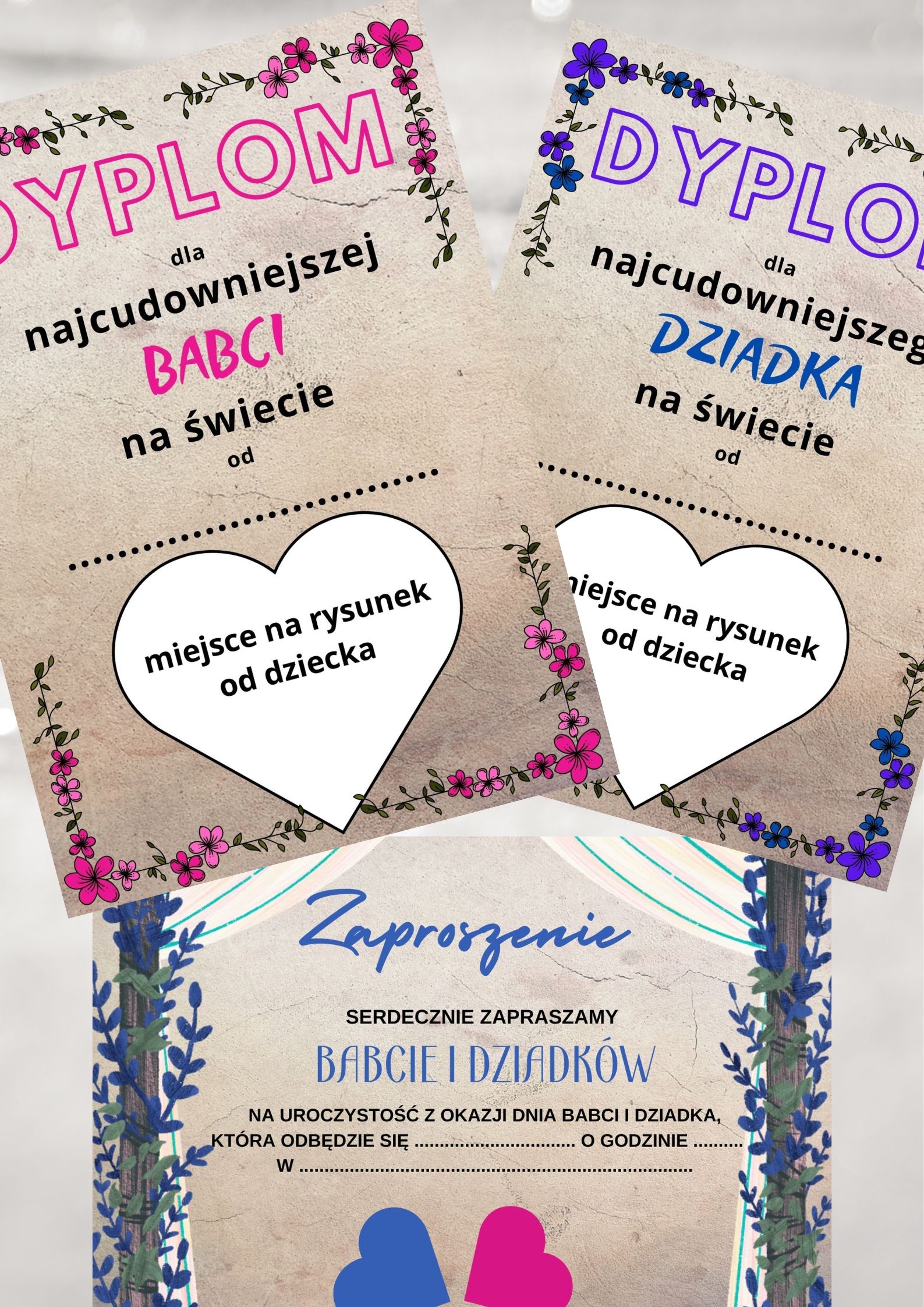 Zestaw zawiera: Dyplom dla Babci, Dyplom dla Dziadka, Zaproszenie, Plakat, Kalendarz, Girlanda z napisem Dzień Babci i Dziadka oraz girlanda w tym samym stylu z napisem Sto Lat dla Babci i Dziadka