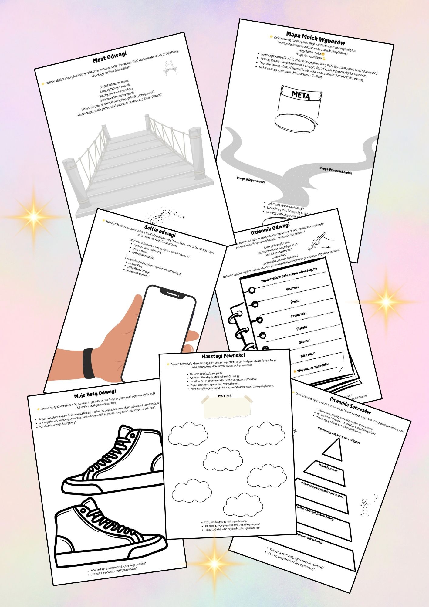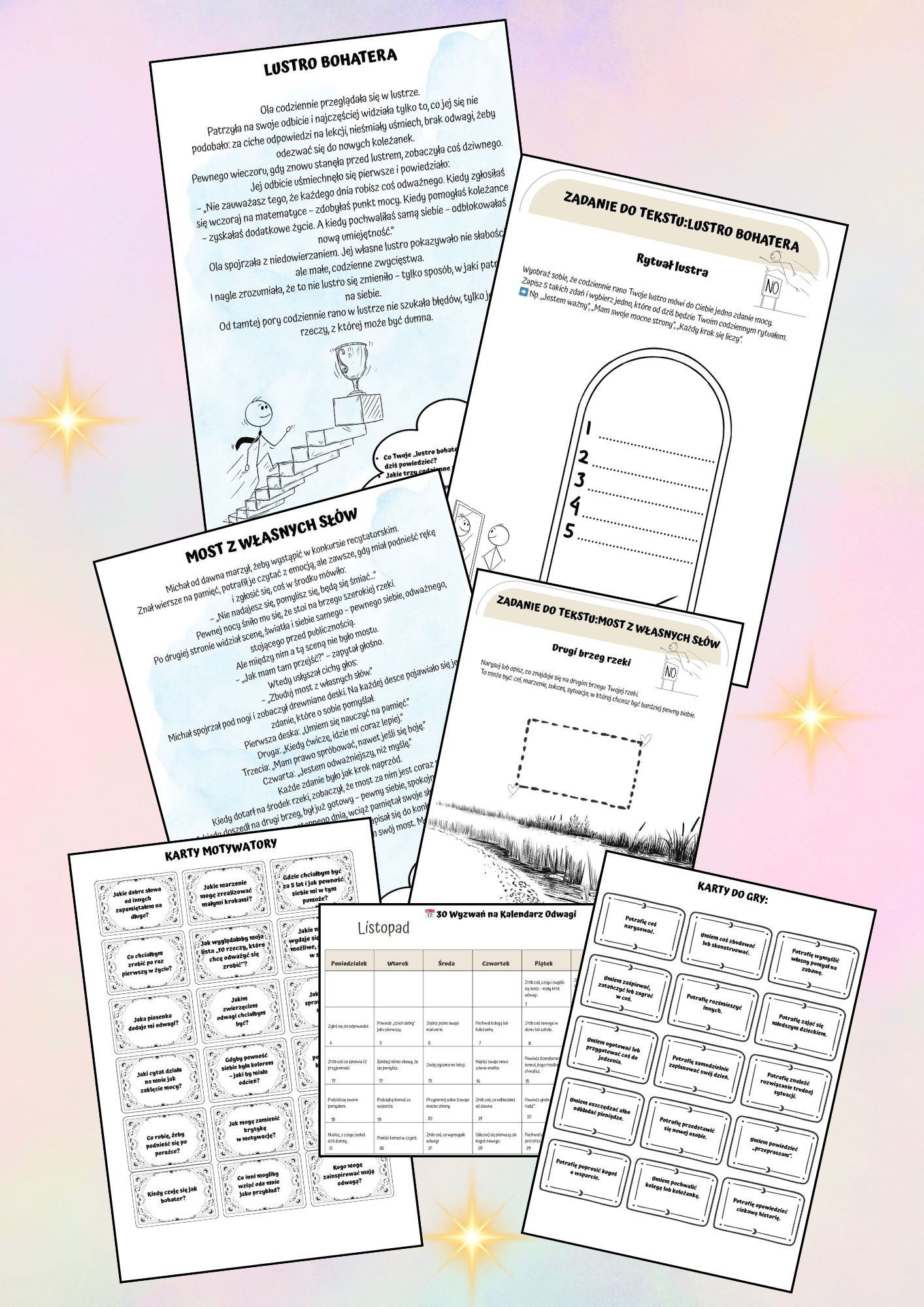 👉 Pakiet przygotowany tak, by uczeń mógł nie tylko czytać, ale też rysować, planować, zaznaczać postępy i zbierać swoje punkty odwagi.