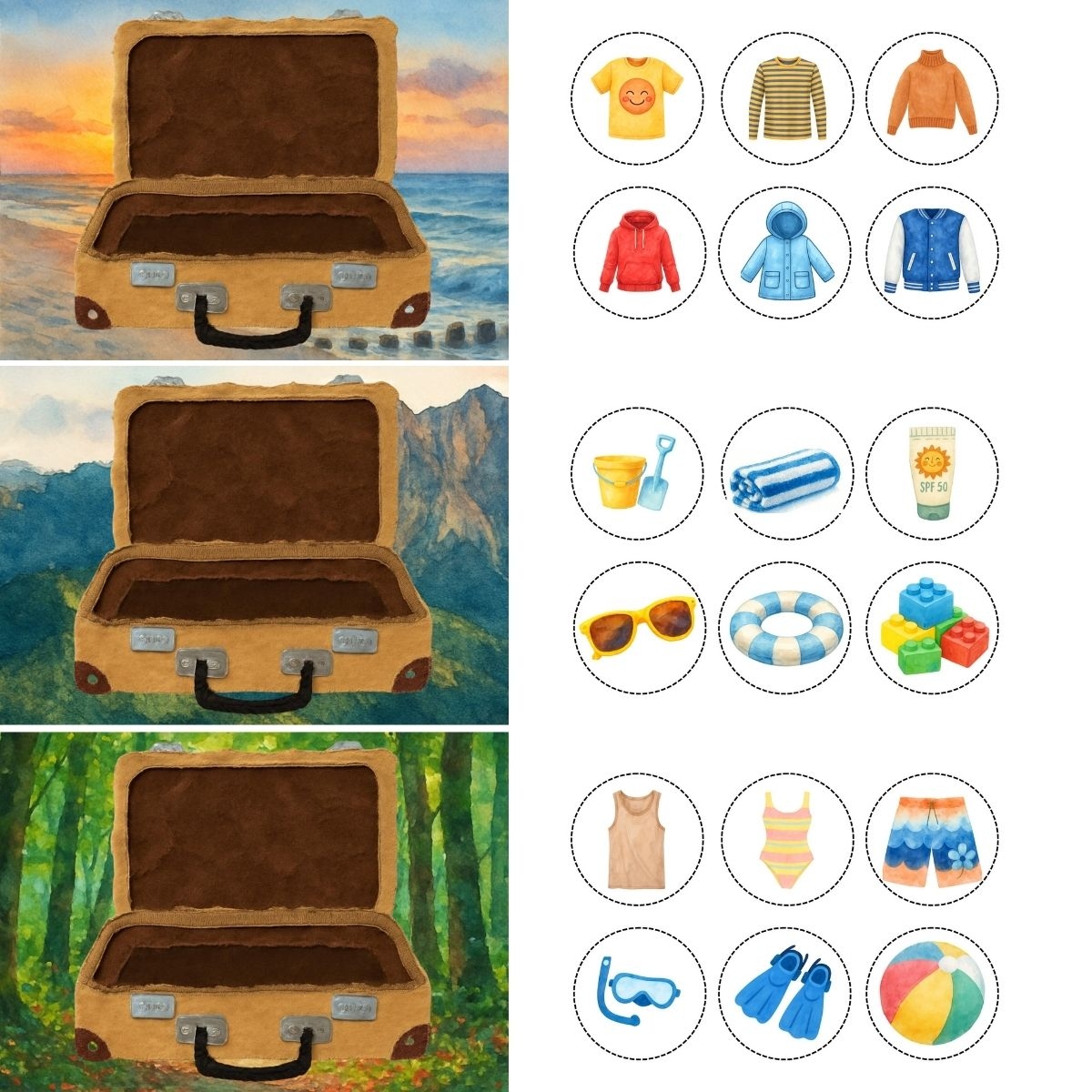 Dziecko losuje kartę z miejscem wyjazdu (np. góry, morze, wieś, miasto) oraz dobiera przedmioty, które powinny znaleźć się w walizce.