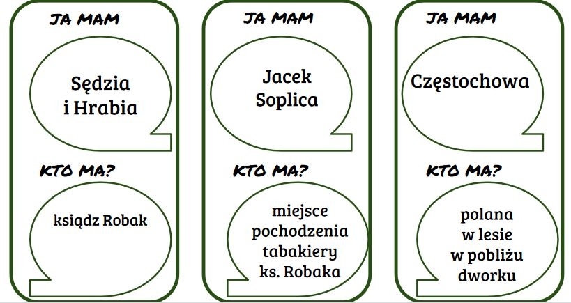 Uczestnicy siadają (stoją) w kręgu. Każde dziecko otrzymuje jedną kartę. Następnie wybieramy osobę, która zacznie odczytywać informacje ze swojej karty. Np. Uczeń 1 odczytuje „Ja mam: autor "Pana Tadeusza". Kto ma syn Jacka Soplicy? ” Pozostali uczniowie muszą być czujni, gdyż teraz musi odezwać się osoba, która ma "Tadeusz Soplica" na swojej karcie (taką opcję ma tylko Uczeń 2). Osoba, która ma taki