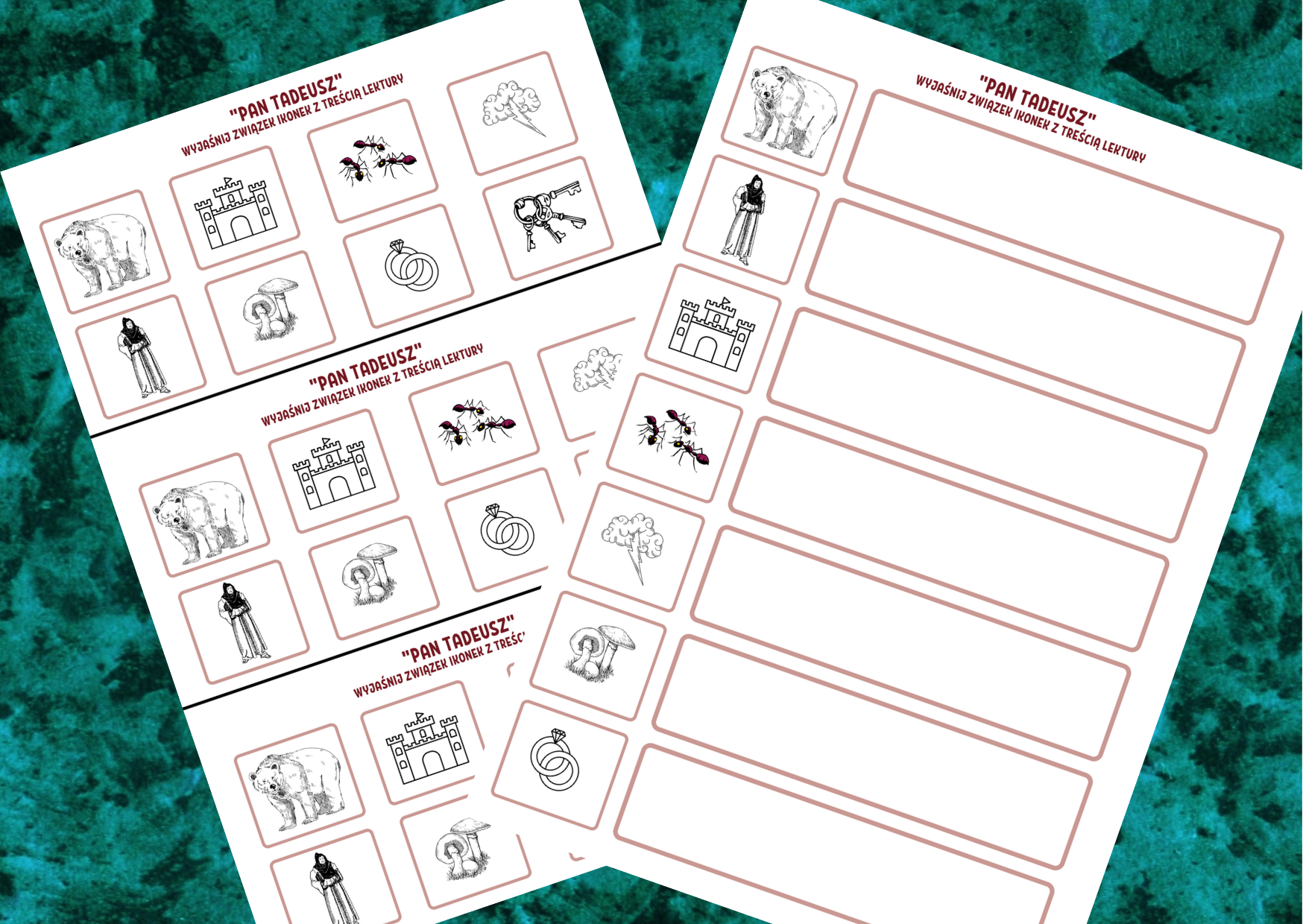 Zestaw "Pan Tadeusz" składa się z karty pracy oraz karty z 3 wklejkami (obie karty pdf w formacie A4), które zawierają ikonki dotyczące treści "Pana Tadeusza".Po wydrukowaniu kart pracy lub wklejek rozdajemy je uczniom, którzy wycinają je, wklejają do zeszytów i pisemnie wyjaśniają, na czym polega związek obrazka z treścią utworu. Ja wykorzystuję takie pomoce na pierwszych lub ostatnich lekcjach poświęconych konkretnej lekturze.