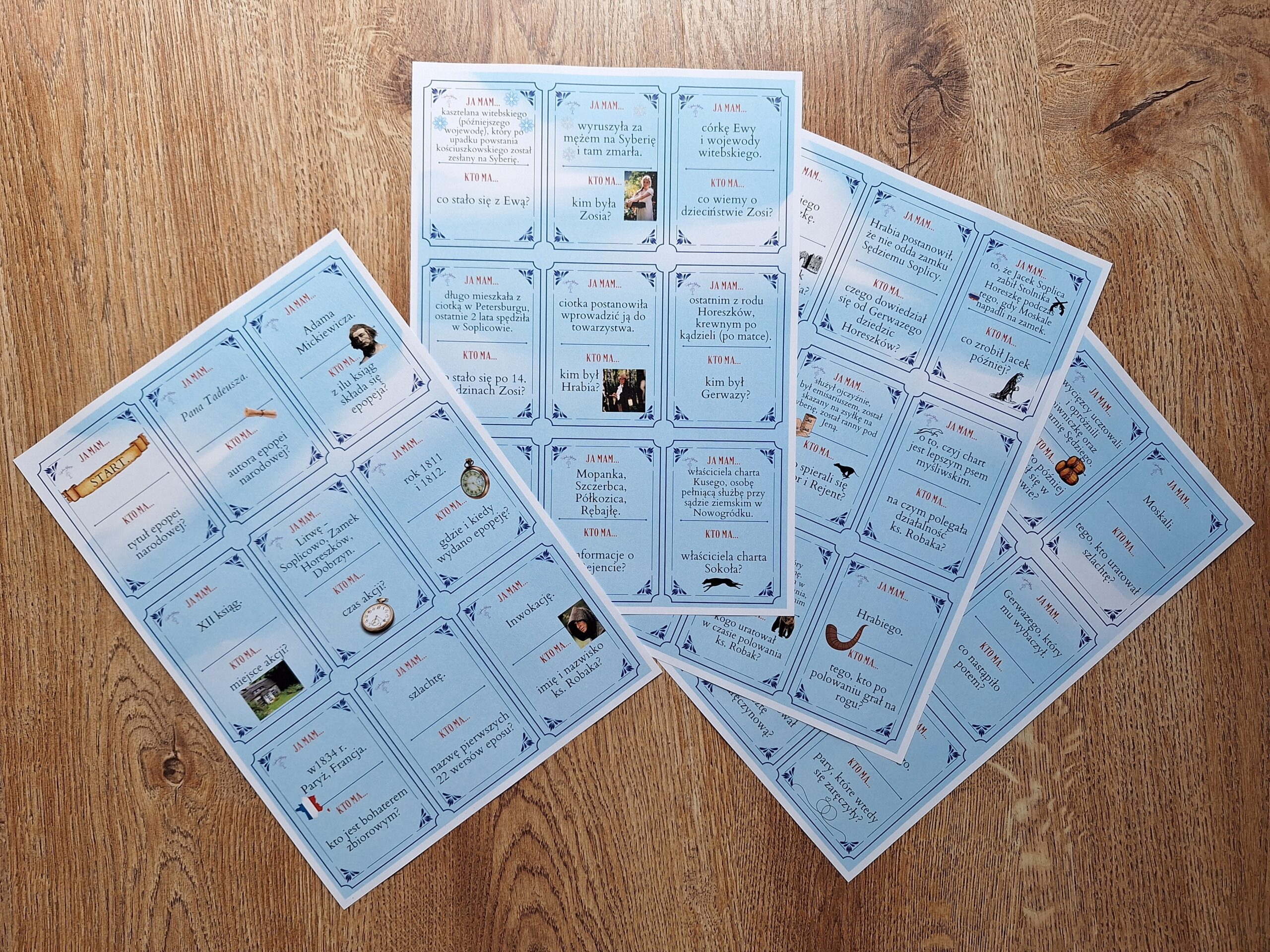 Karty do gry Ja mam... Kto ma... Pan Tadeusz to atrakcyjny sposób zarówno sprawdzenia znajomości lektury, jak i powtórzenia jej treści. Dzięki grafice nawiązującej do treści lektury karty doskonale sprawdzą się jako pomoc w powtórkach przed egzaminem ósmoklasisty.