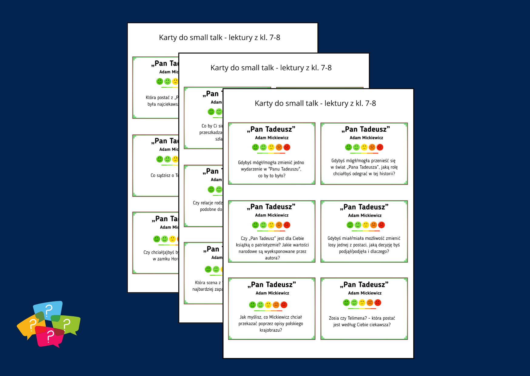 18 pytań typu „Karty small talk” do „Pana Tadeusza”. Takie pytania mają charakter swobodny, zachęcają do refleksji, rozmowy i dzielenia się opinią, a nie tylko sprawdzają wiedzę. Mogą być wykorzystywane na lekcjach jako forma integracji z lekturą lub podczas luźniejszych rozmów literackich. Dzięki nim można ćwiczyć wypowiedź argumentacyjną. Zasady: uczeń losuje kartę i odpowiada na pytanie (lub wszyscy uczniowie odpowiadają na to samo pytanie).