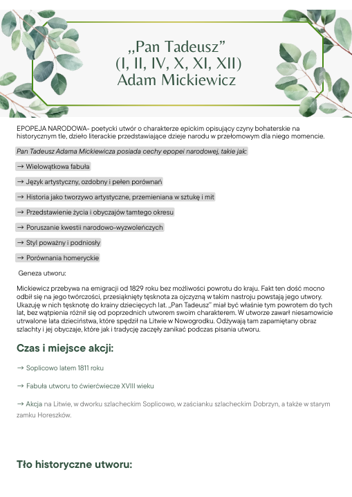 Zawiera najważniejsze informacje o treści, bohaterach, wydarzeniach i przesłaniu epopei. Idealna pomoc przed sprawdzianem, kartkówką lub odpowiedzią ustną.