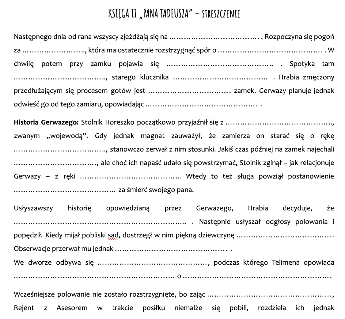 streszczenia z lukami ksiąg wskazanych w PP (ks. I, II, IV, X, XI, XII) z odpowiedziami – uporządkowane, krótkie, świetne zarówno do wprowadzenia, jak i utrwalenia i powtórek