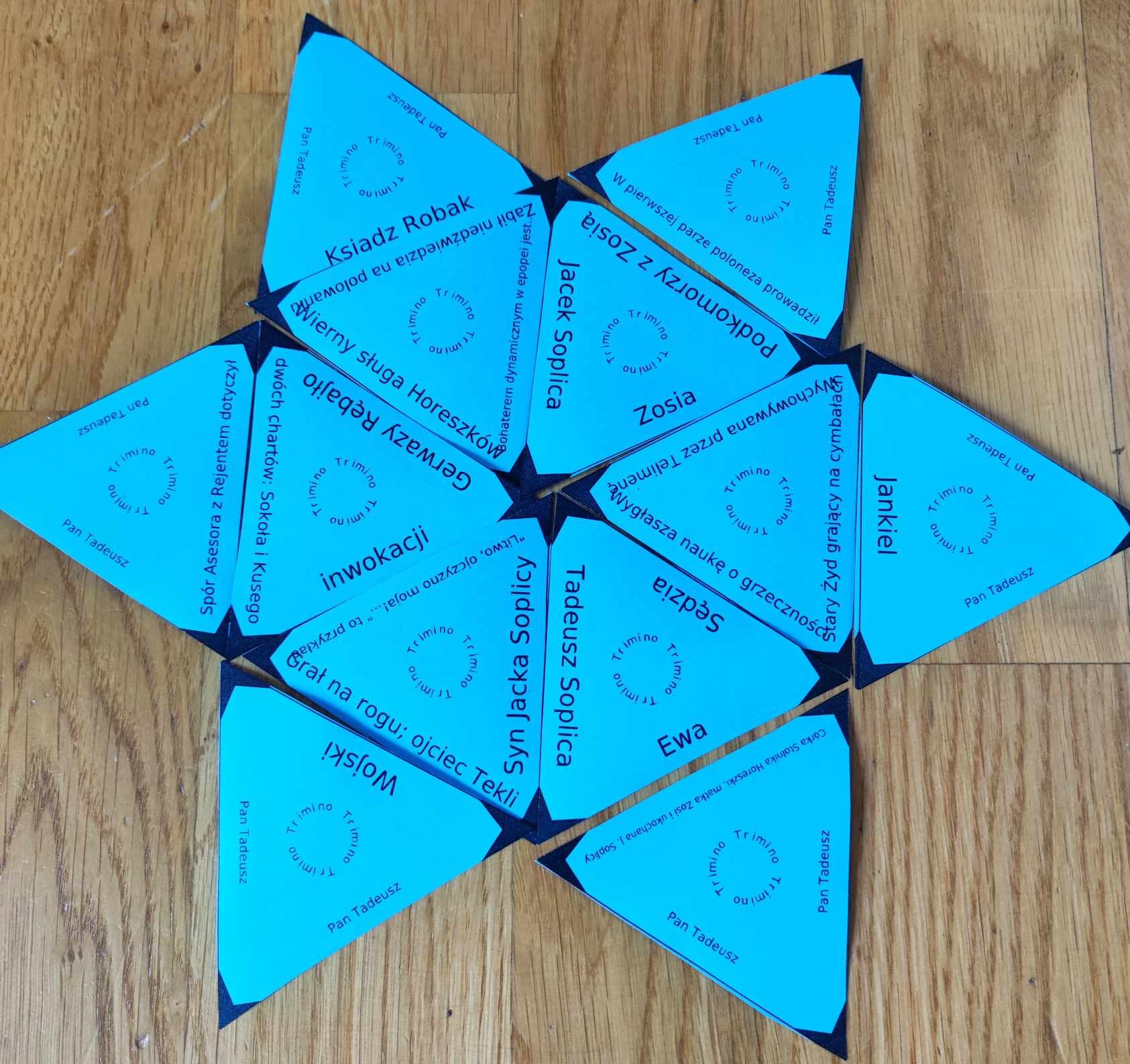 Trimino to gra dydaktyczna, która polega na ułożeniu odpowiedniej figury w taki sposób, żeby pasowały wszystkie elementy. Gra angażuje i motywuje uczniów do wnikliwego czytania, uczy spostrzegawczości. Można ją wykorzystać jako ciekawy przerywnik podczas lekcji; jako jedno z poleceń np. w stacjach zadaniowych; może też być elementem projektu.