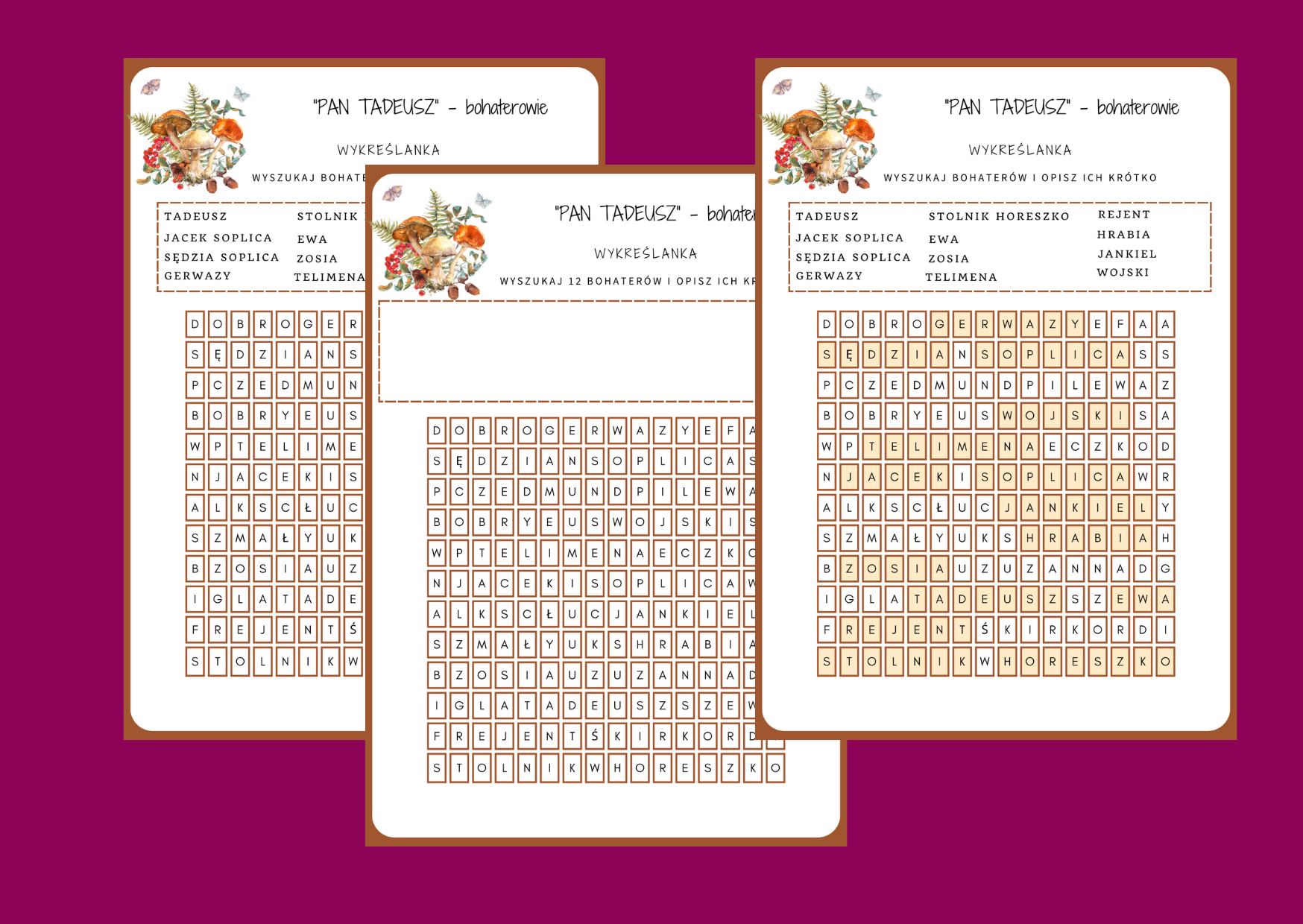 Materiał zawiera wykreślankę dotyczącą „Pana Tadeusza” (3 wersje: z odpowiedziami, bez odpowiedzi, bez wyrazów do odnalezienia).