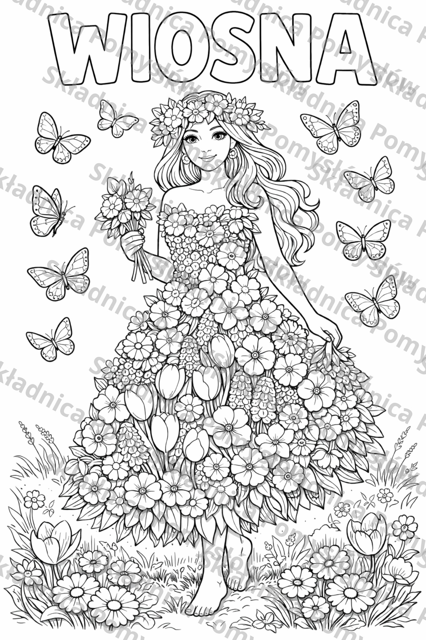 Materiał PANI WIOSNA to estetyczny zestaw dekoracyjno-plastyczny do druku, przedstawiający postać Pani Wiosny w dwóch formatach: jako plakat wielkoformatowy składany z 9 stron A4 oraz jako pojedyncza karta w formacie A4. Ilustracja utrzymana jest w wiosennej tematyce, z bogatymi detalami roślinnymi i motylami, dzięki czemu materiał świetnie sprawdzi się jako dekoracja sali, gazetka tematyczna lub pomoc do zajęć o wiośnie.