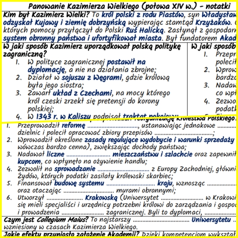 Notatki w formie pytań i odpowiedzi omawiające okres rządów Kazimierza Wielkiego w Polsce, przygotowane dla klasy 5 według podstawy programowej nauczania historii w szkole podstawowej (Podstawa programowa – Historia – Szkoła podstawowa IV-VIII) oraz utrwalająca wiedzę karta pracy zawierająca luki w treści wymagające uzupełnienia ustnego lub pisemnego.