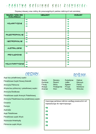 Karta pracy, której celem jest poznanie państw roślinnych świata. Zadanie polega na przyporządkowaniu spośród niżej wymienionych obszarów oraz roślin do podanych państw roślinnych.