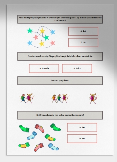Zestaw edukacyjny „Pary” to świetna pomoc dydaktyczna dla dzieci w wieku przedszkolnym i wczesnoszkolnym 👶📘. Materiał rozwija logiczne myślenie 🧠, spostrzegawczość 👀 oraz uczy pojęcia „para” w zabawny i angażujący sposób 🎉.