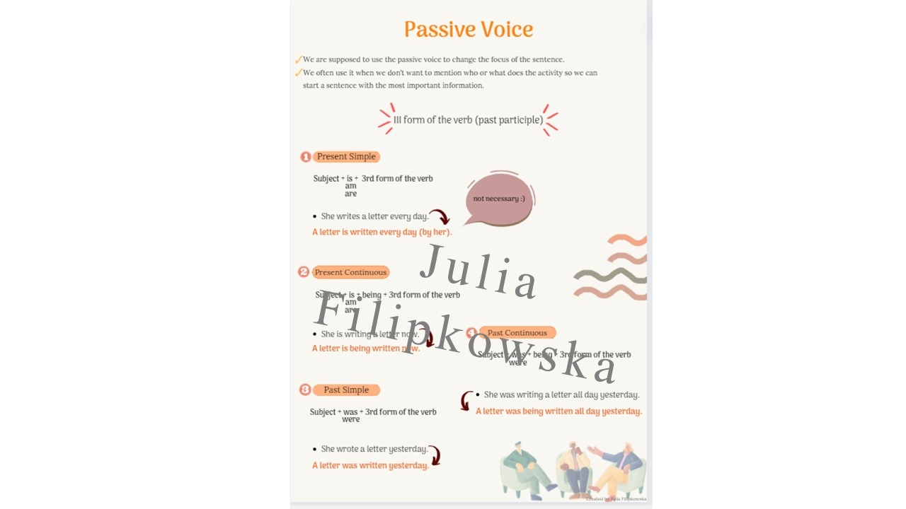 Zapraszam do zakupu materiału w języku angielskim aż 6 stron A4 jasno i klarownej rozpisanej teorii dotyczącej strony biernej w języku angielskim (passive voice) wraz z zadaniami do rozwiązania, zadaniem na mówienie, oraz 3 stronnym kluczem dla nauczyciela. W pliku zostało zawarte wszystko, co najważniejsze dotyczące tego zagadnienia gramatycznego.