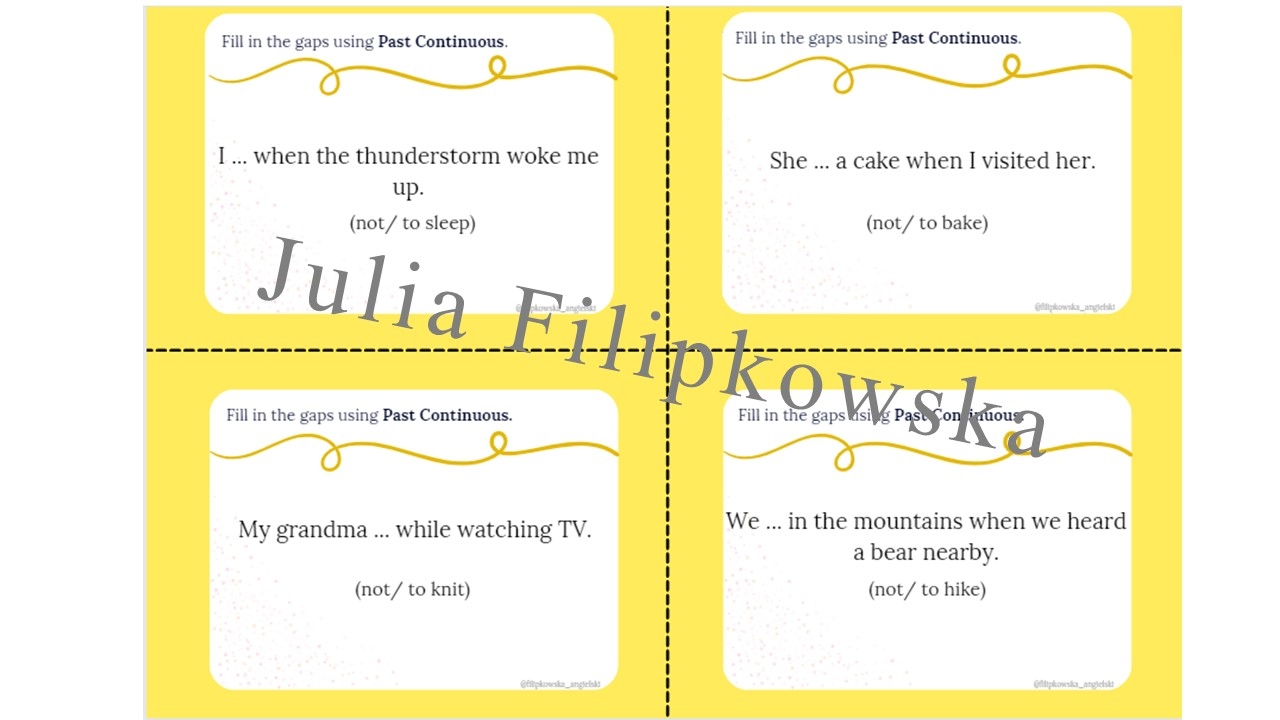 Zapraszam do zakupu materiału w języku angielskim: 20 kart do ćwiczenia Past Continuous w mowie (5 stron A4). Zadanie polega na uzupełnieniu zdania brakującym (podanym) czasownikiem używając Past Continuous. Materiał idealny na rozgrzewkę przypominającą gramatykę dla uczniów na początek zajęć, lub dla uczniów przygotowujących się do różnych egzaminów. Polecam karty wyciąć i zalaminować dzięki czemu wystarczą na wiele lat.