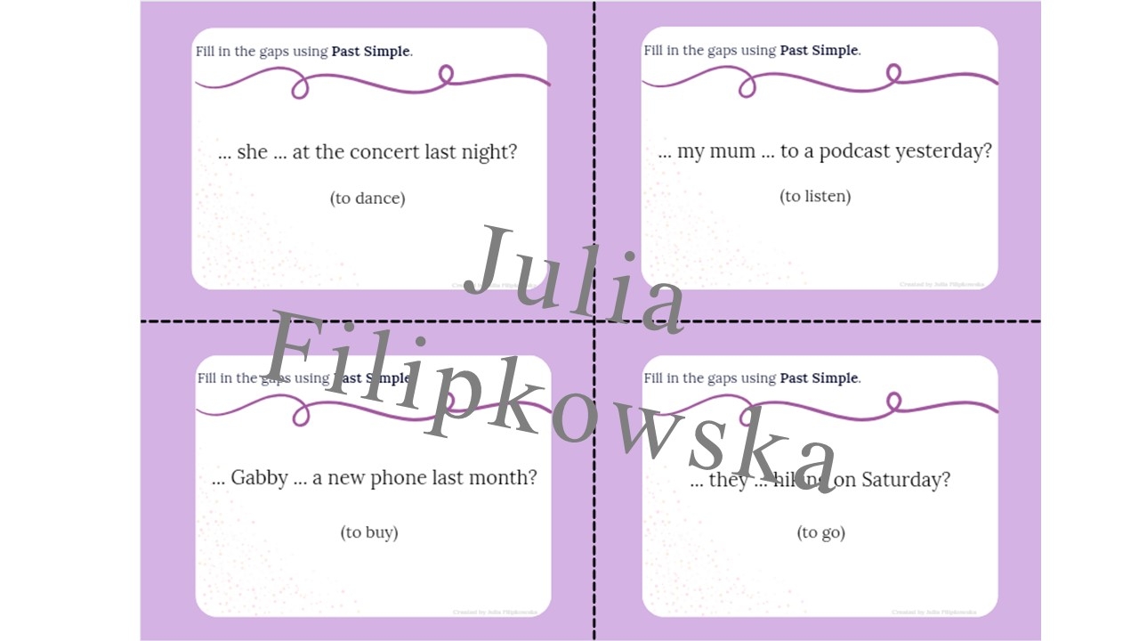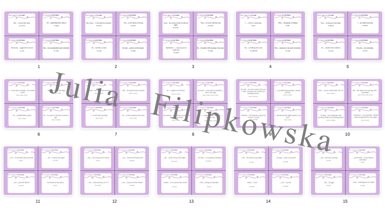 Zapraszam do zakupu materiału w języku angielskim: 60 kart do ćwiczenia Past Simple w mowie (15 stron A4). Zadanie polega na uzupełnieniu zdania brakującym (podanym) czasownikiem używając Past Simple. Materiał idealny na rozgrzewkę przypominającą gramatykę dla uczniów na początek zajęć, lub dla uczniów przygotowujących się do różnych egzaminów. Polecam karty wyciąć i zalaminować dzięki czemu wystarczą na wiele lat.