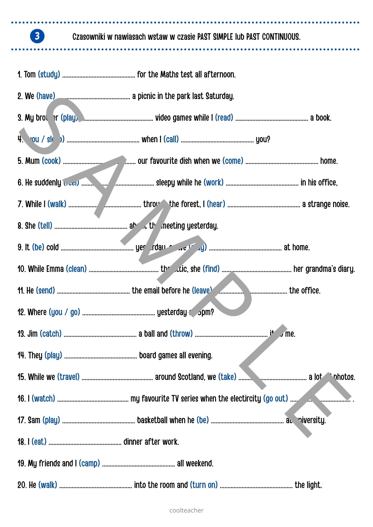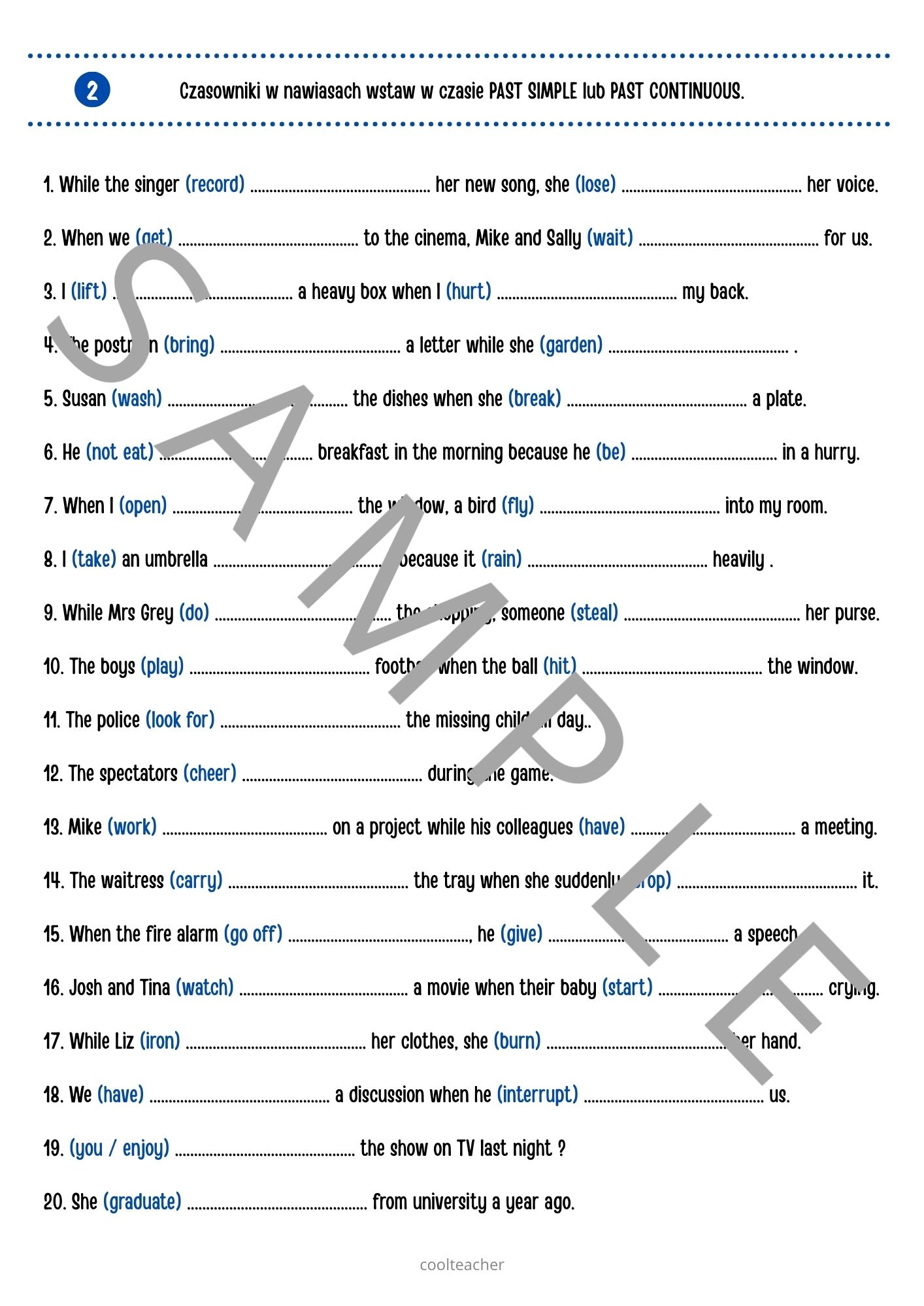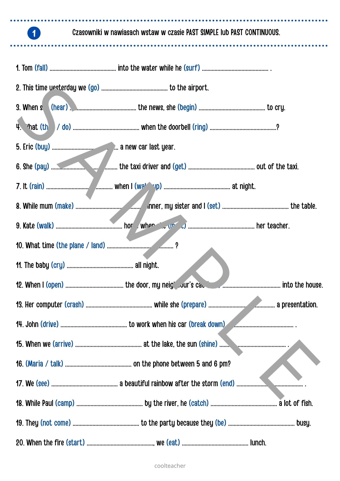 Materiał ćwiczeniowy polegający na uzupełnianiu zdań w odpowiednim czasie. Pomoże uczniom opanować umiejętność rozróżniania i stosowania czasów PAST SIMPLE i PAST CONTINUOUS.