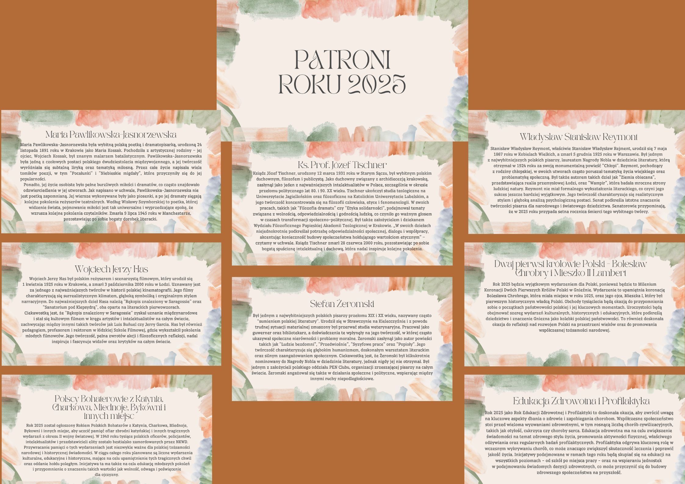 Materiał stanowi strona tytułowa oraz 8 plansz poświęconych: Marii Pawlikowskiej-Jasnorzewskiej, Władysławowi Stanisławowi Reymontowi, Ks. Prof. Józefowi Tischnerowi, Stefanowi Żeromskiemu, Wojciechowi Jerzemu Hasowi, pierwszym królom Polski, bohaterom z Katynia, Charkowa i Miednoje oraz profilaktyce zdrowotnej. Plik zapisany w formacie .pdf.