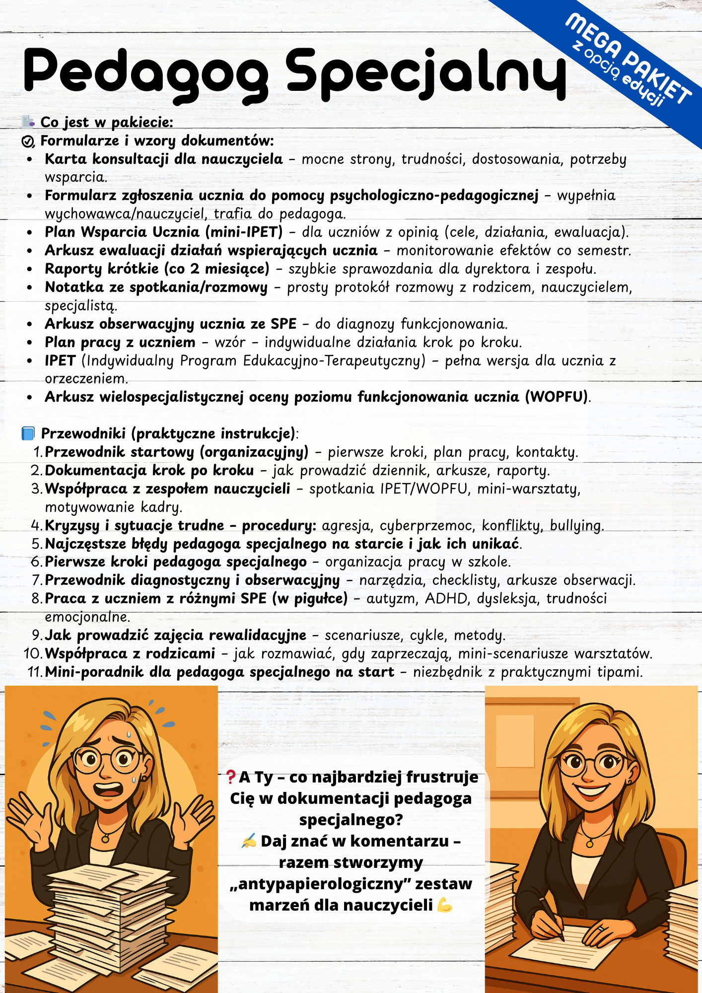 Pedagog Specjalny - wzory IPET, WOPFU, mini-IPET, arkusze obserwacji, raporty, karty konsultacji przewodniki krok po kroku: jak prowadzić zajęcia rewalidacyjne, współpracować z rodzicami,