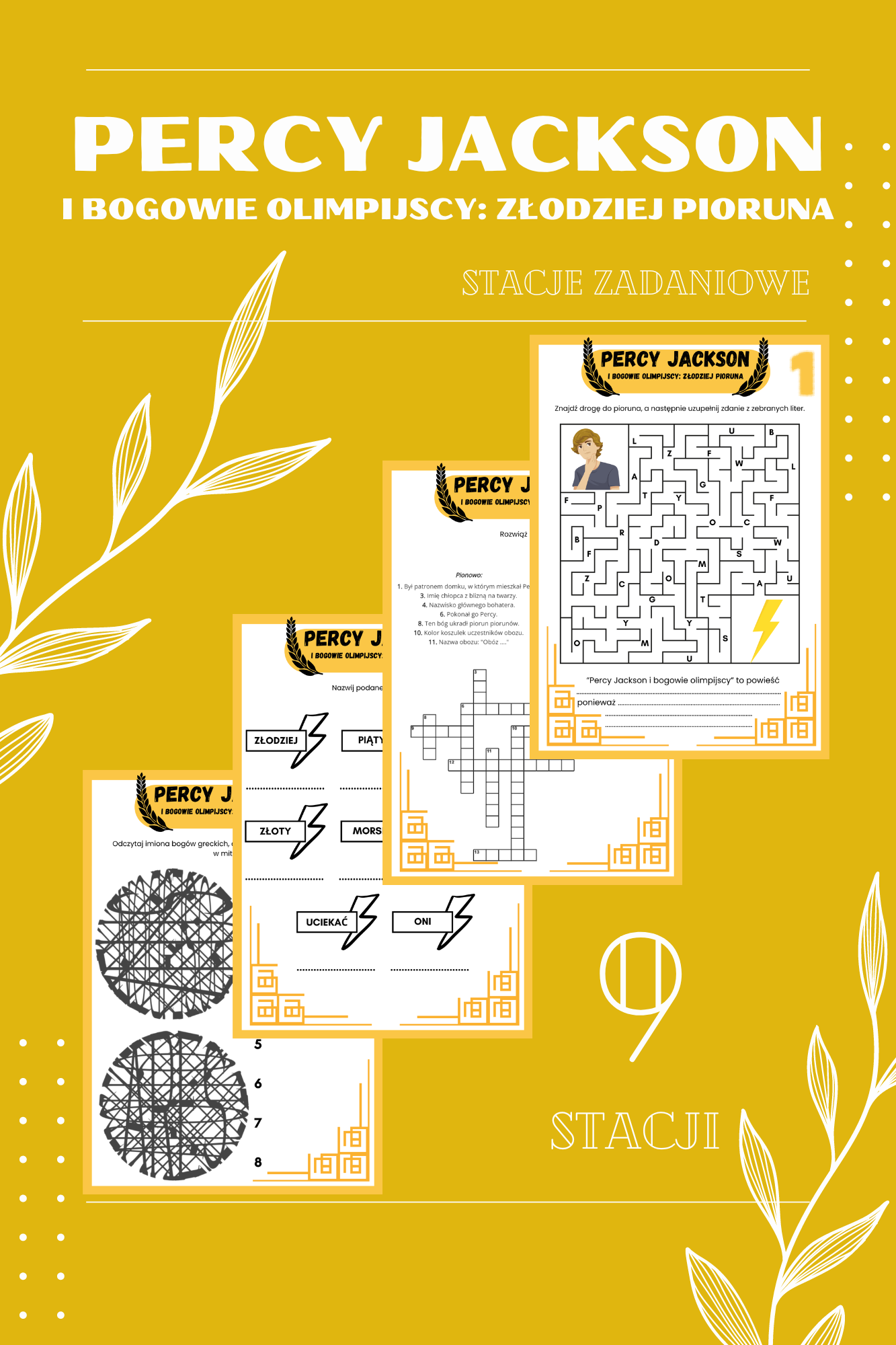 Zestaw zawiera dziewięć kart z różnymi stacjami zadaniowymi z lektury „Percy Jackson i bogowie olimpijscy: Złodziej pioruna”.