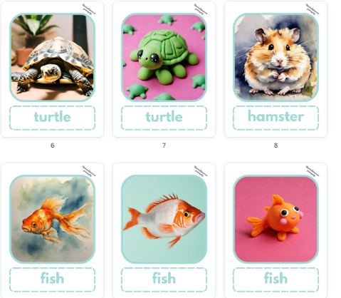 Trzy wersje (ilustracja, zdjęcie , zwierzątko z plasteliny) kart obrazkowych z napisami do wprowadzenia słownictwa związanego z zwierzątkami domowymi -"PETS": dog, cat, iguana, fish, hamster, canary, parrot, guinea pig, turtle, rabbit.