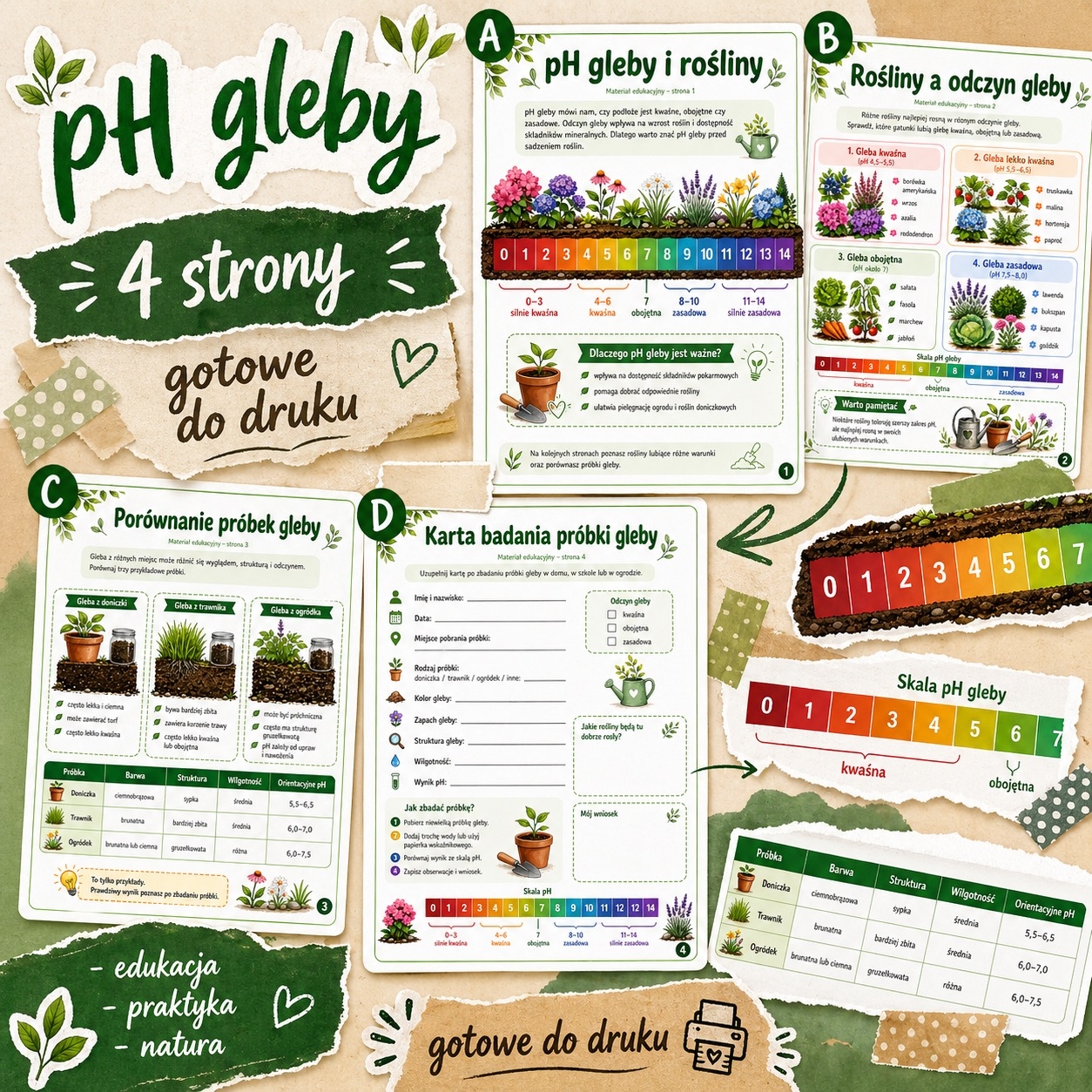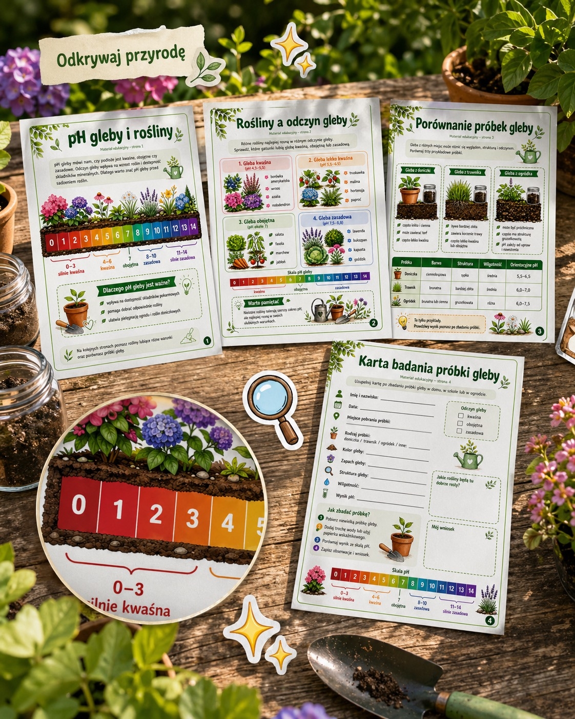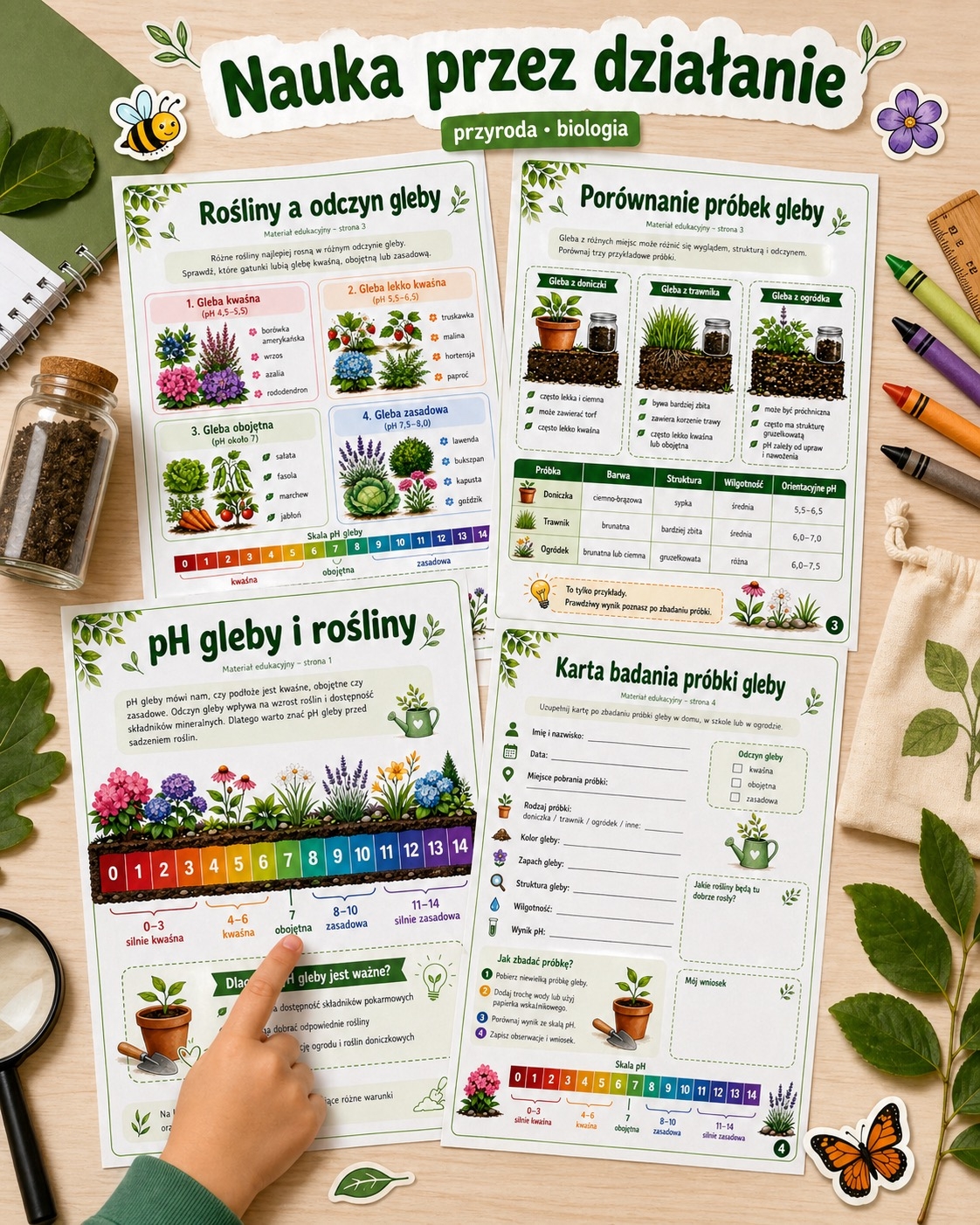 Przygotowałam 4-stronicowy materiał edukacyjny „pH gleby i rośliny”, który w prosty i atrakcyjny sposób pomaga uczniom zrozumieć, czym jest odczyn gleby i dlaczego ma znaczenie dla wzrostu roślin.