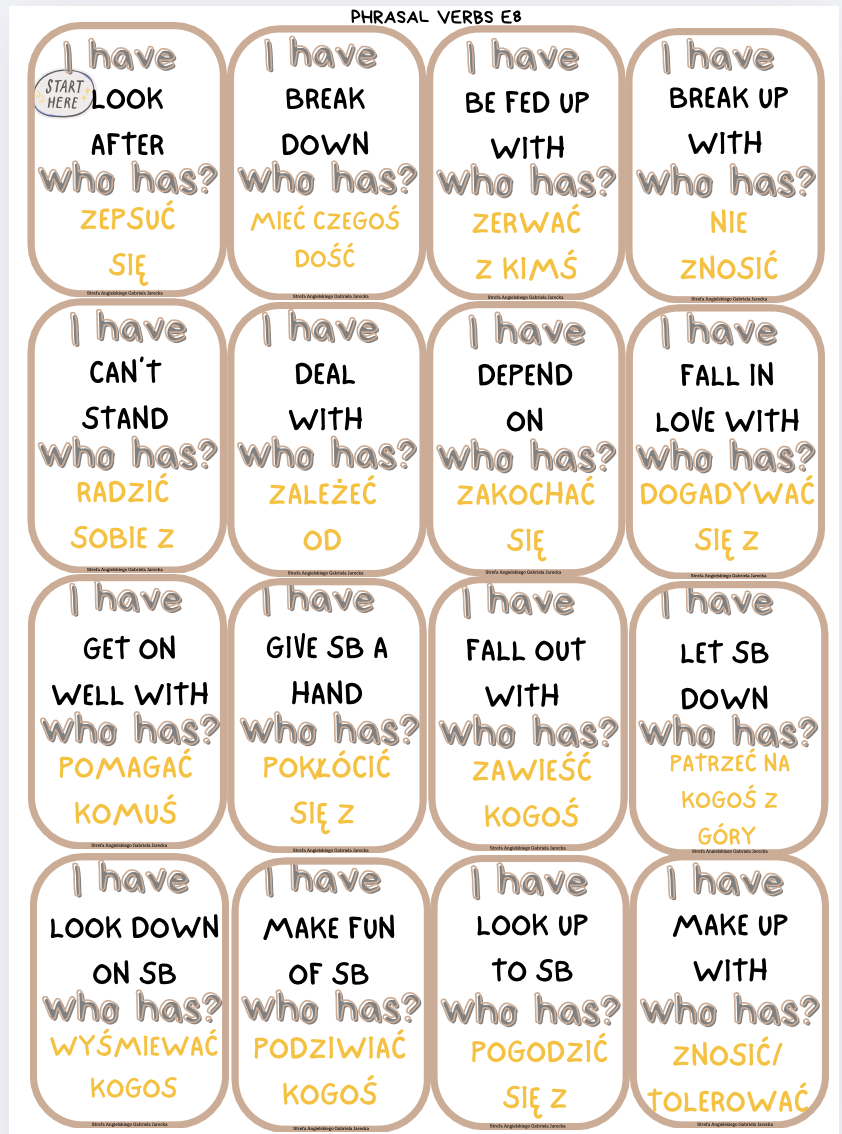 Gra I have who has na powtórzenie i utrwalenie podstawowych czasowników frazowych (80) potrzebnych do egzaminu ósmoklasisty.