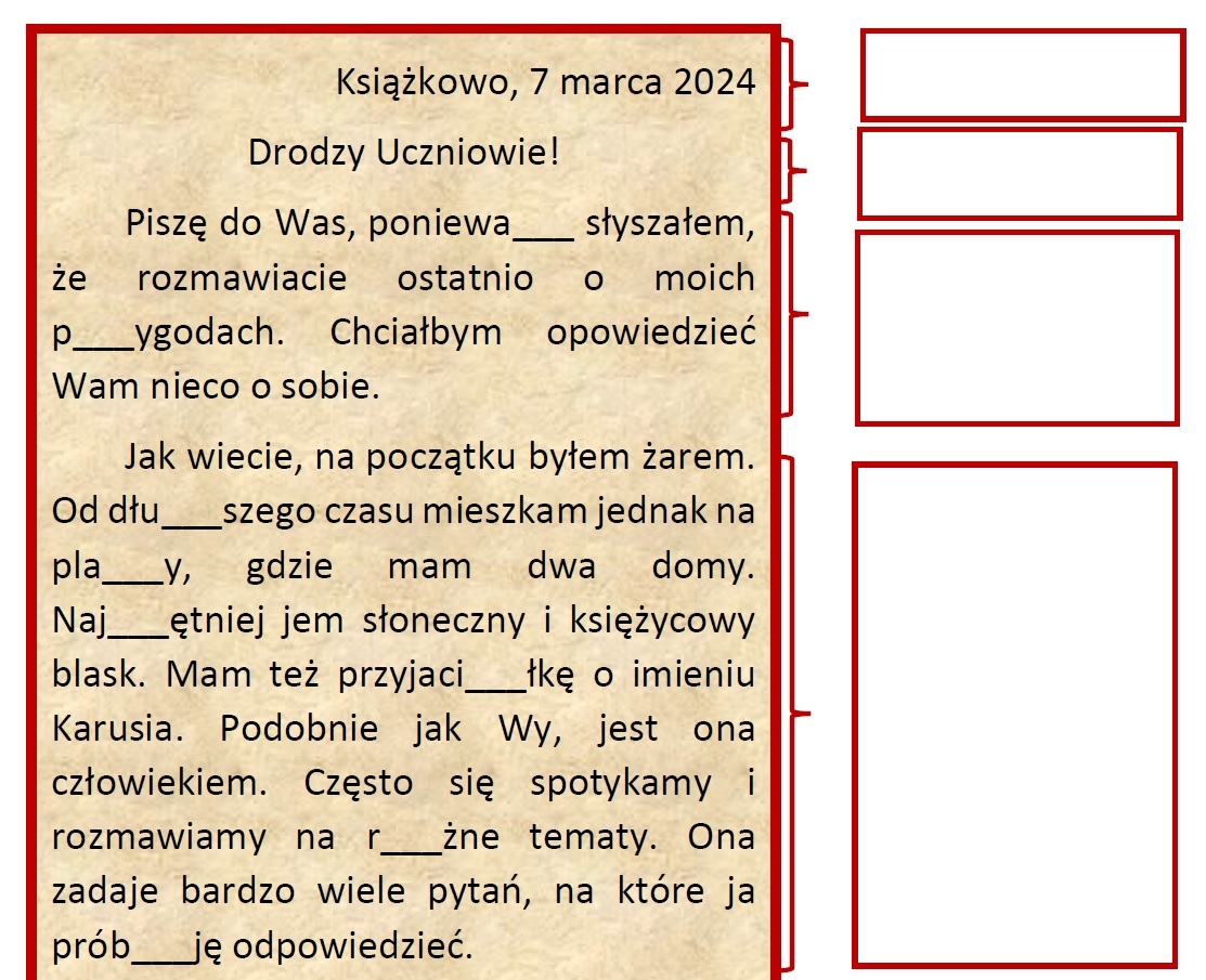 Zachęcam do zakupu materiału wprowadzającego lub utrwalającego strukturę listu. Zadania nawiązują do często czytanej w szkole książki "Piaskowy Wilk", pozwalają też ćwiczyć poprawną pisownię. Składają się z listu od Piaskowego Wilka, arkusza, na którym dzieci mają napisać odpowiedź, oraz sugestii dydaktycznych.