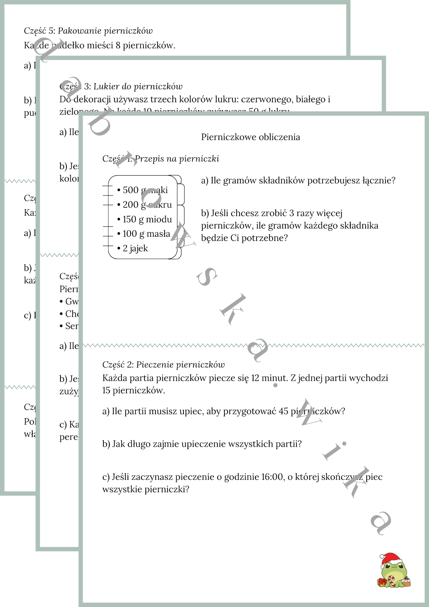 • Część 2: Pieczenie pierniczków – Zadania dotyczą obliczeń związanych z czasem pieczenia i liczbą partii, co pomaga w utrwaleniu operacji dzielenia i mnożenia.