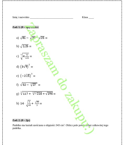 Materiał dotyczy pierwszych lekcji dotyczących pierwiastków. Sprawdza opanowanie umiejętności obliczania pierwiastków kwadratowych i sześciennych z liczb, które są odpowiednio kwadratami lub sześcianami licz wymiernych.