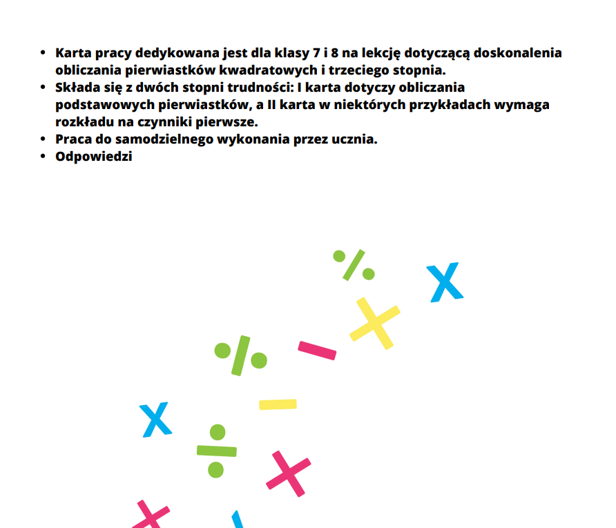 Karta pracy dedykowana jest dla klasy 7 i 8 na lekcję dotyczącą doskonalenia obliczania pierwiastków kwadratowych i trzeciego stopnia.