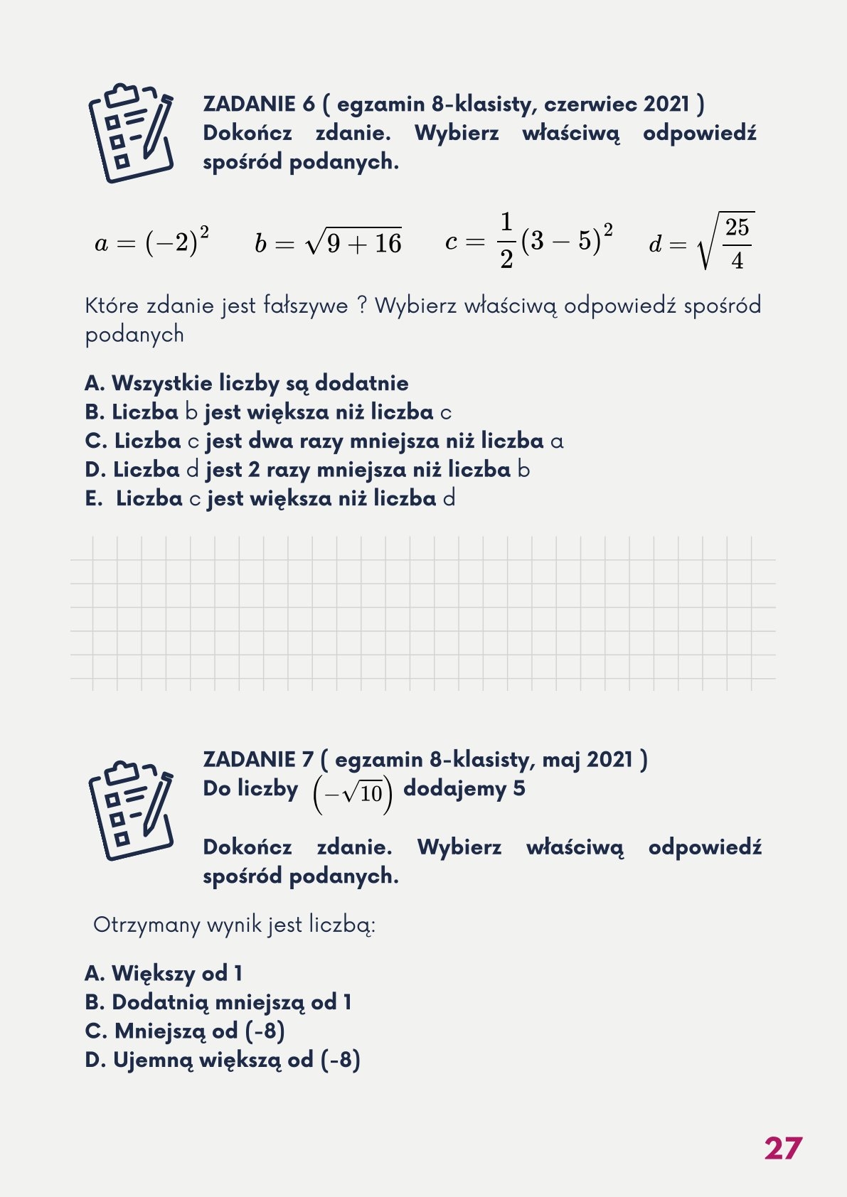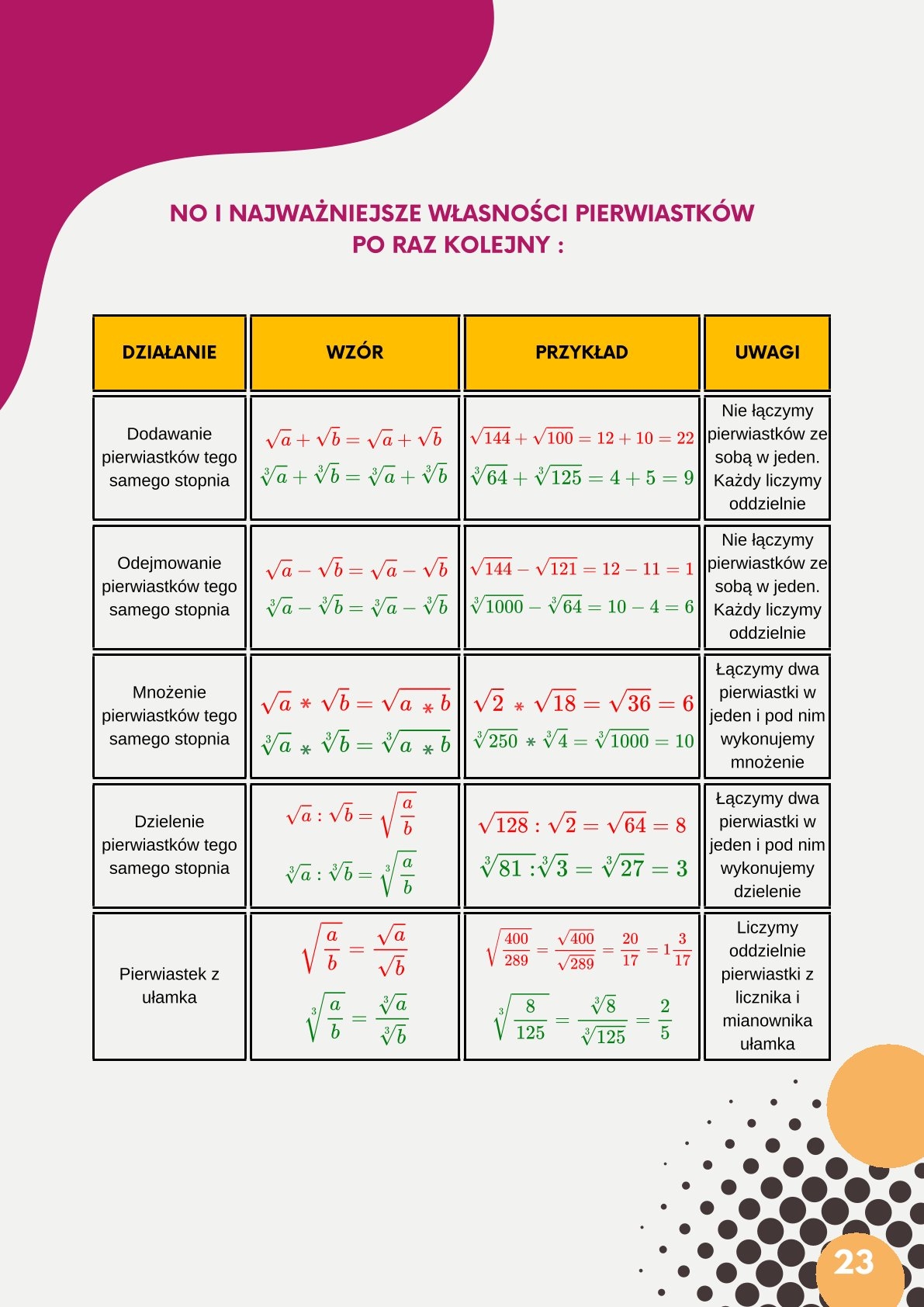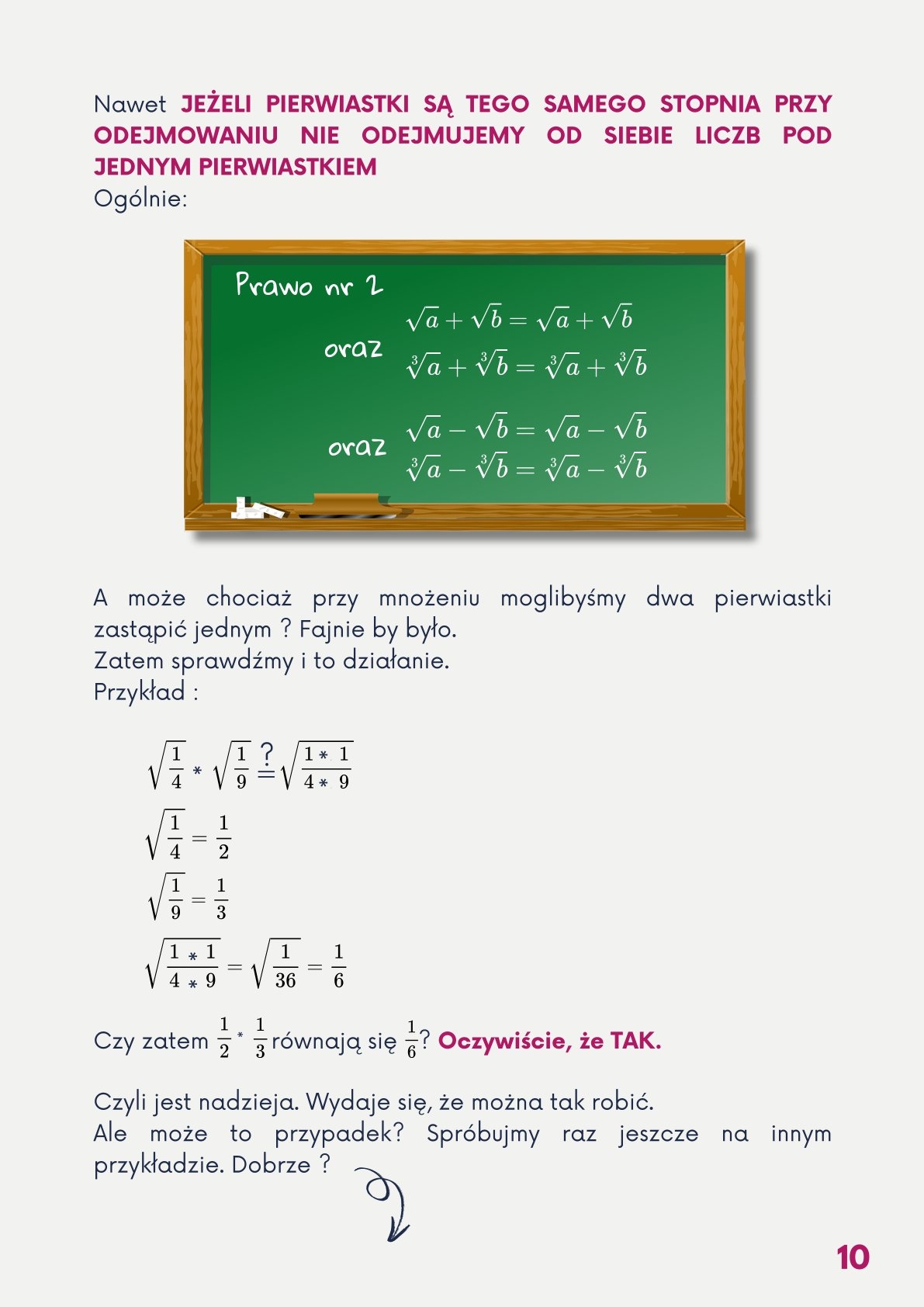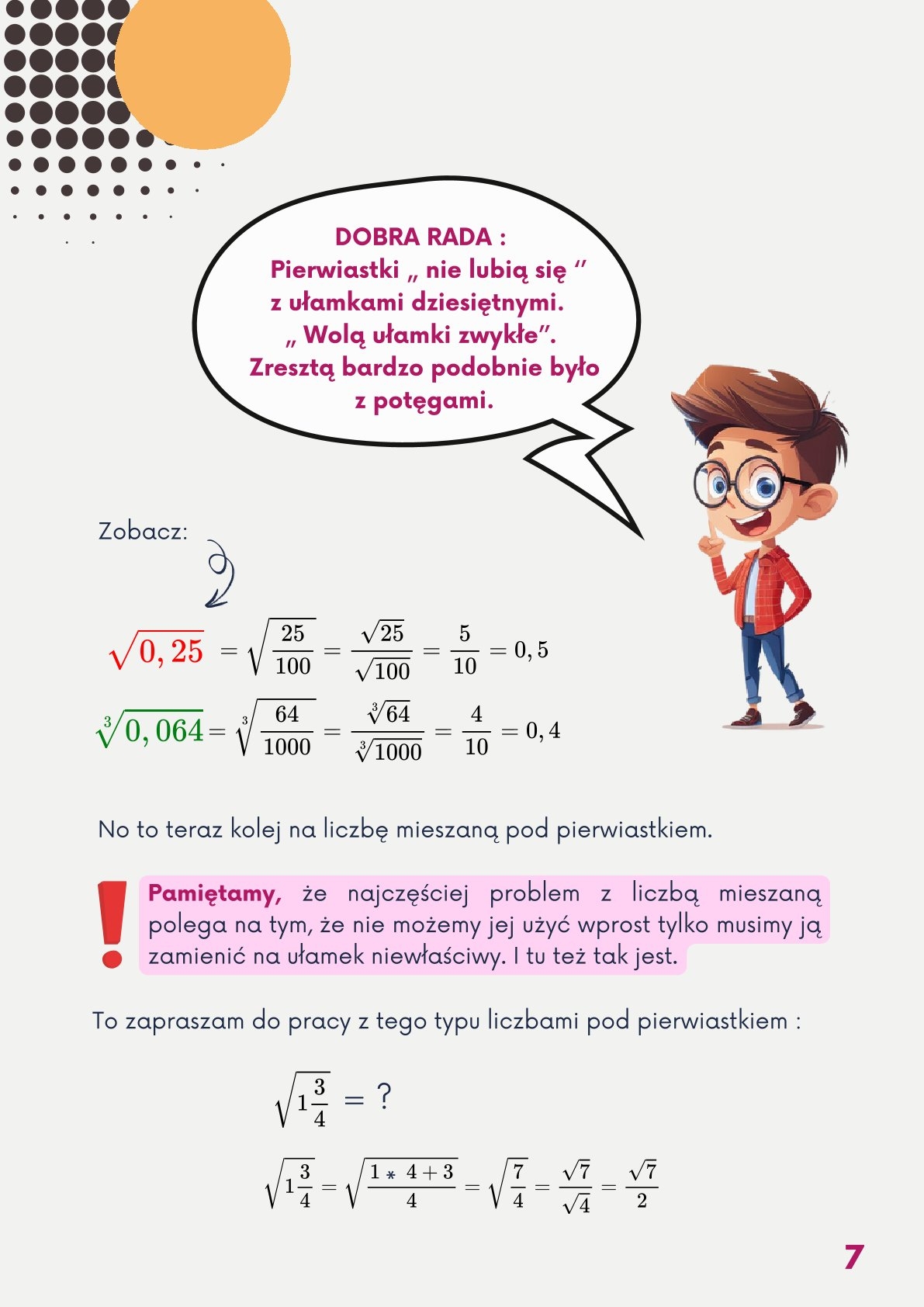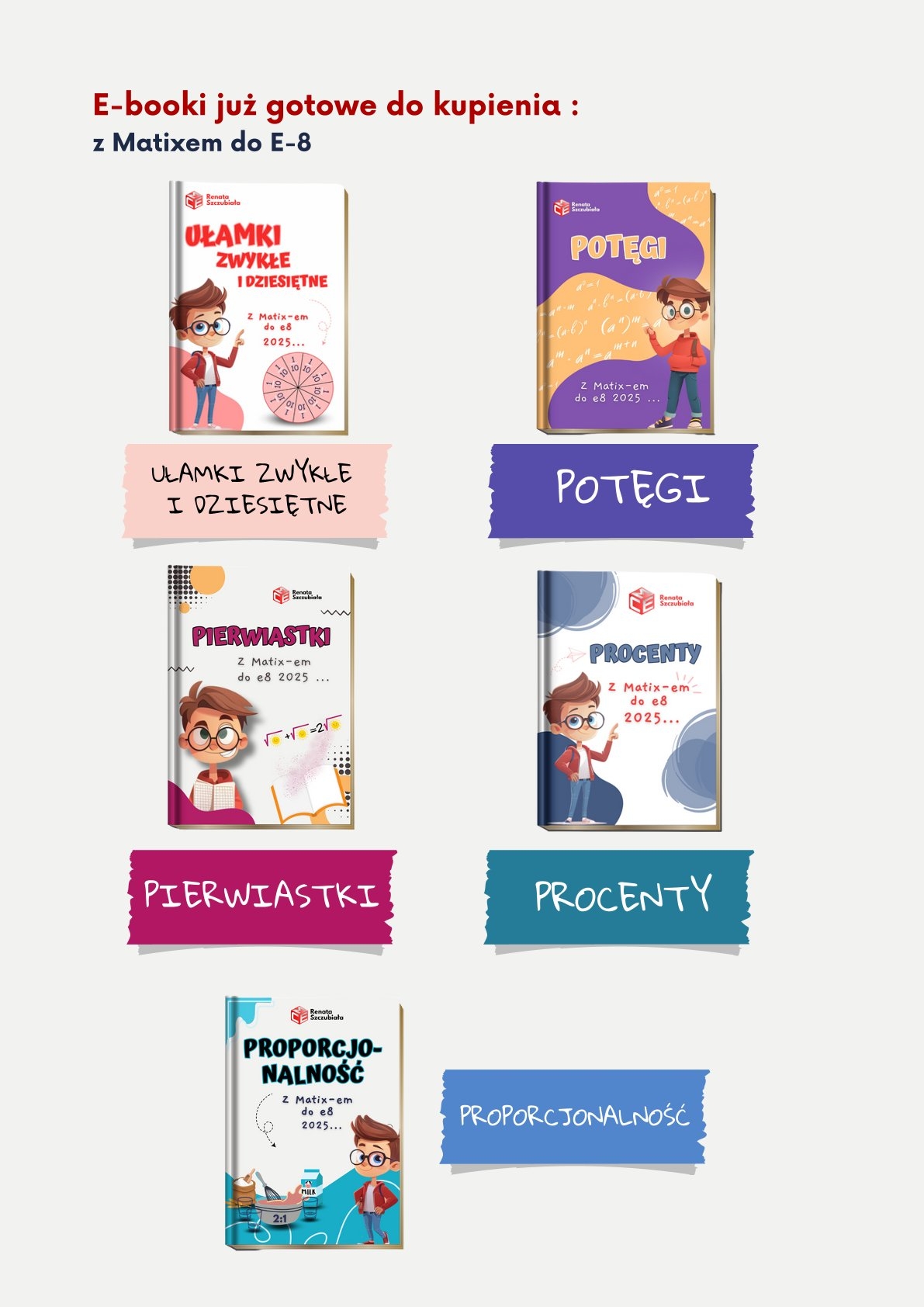 Jeśli zapytać ósmoklasisty, który z tematów do egzaminu jest dla niego trudny- to z pewnością wśród nich będą PIERWIASTKI. Dlatego daję słowo, że po przeczytaniu i przećwiczeniu zadań z tego e-booka uczeń z pewnością zmieni zdanie. Niezbędna teoria, przykłady , zadania do samodzielnego rozwiązania, zadania egzaminacyjne CKE, tabelki korzyści – to wszystko tu znajdziemy. Cudowne kolorowe grafiki to „ wisienka na torcie”.