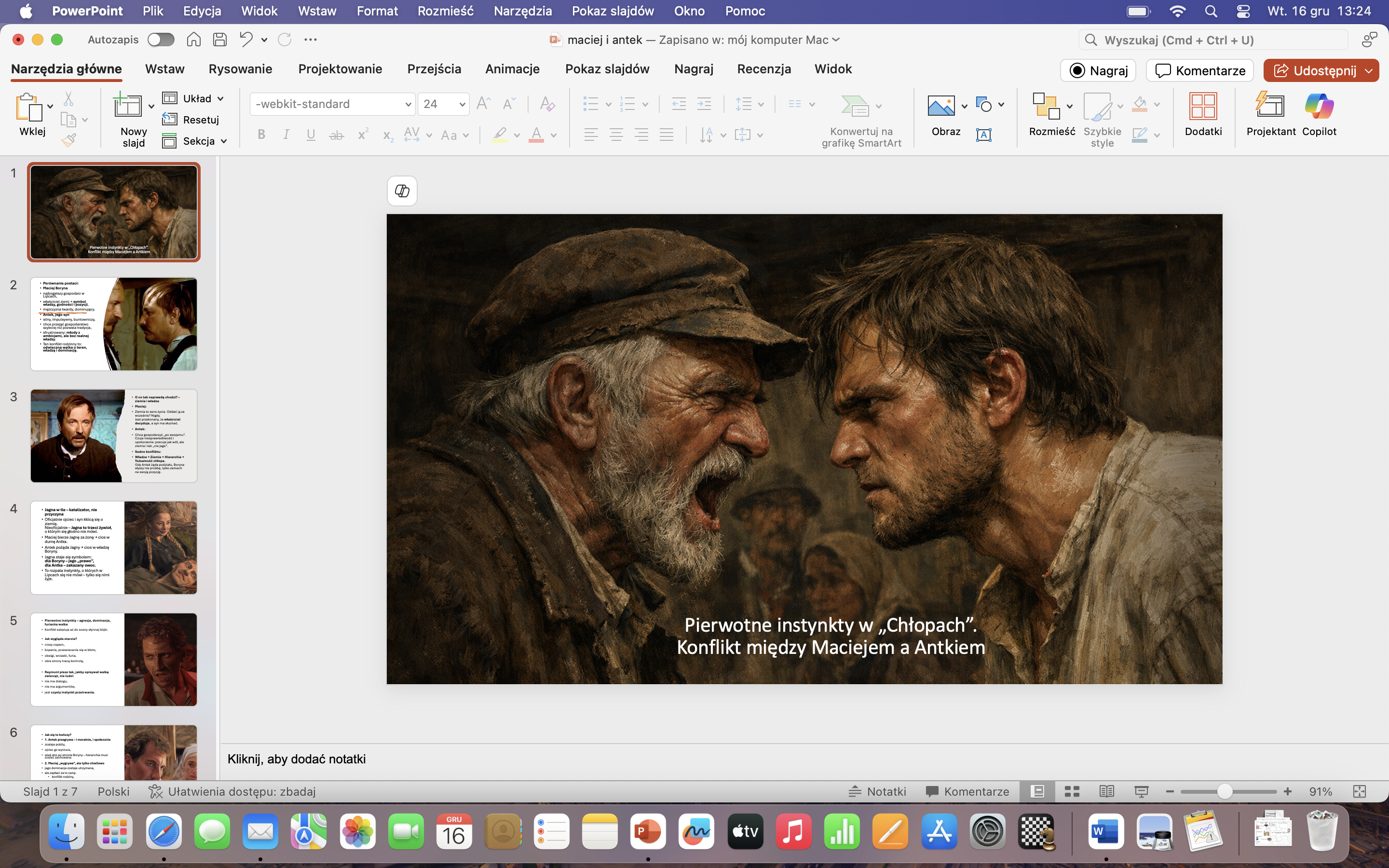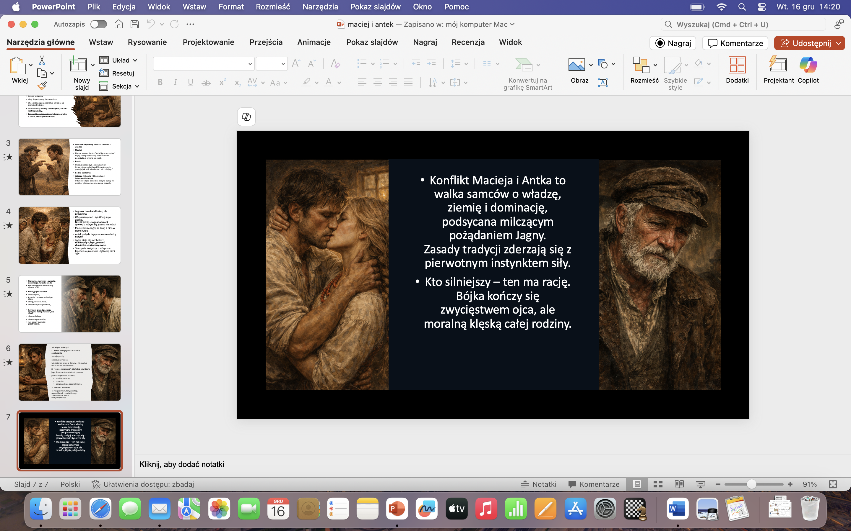 Prezentacja zawiera: - analizę konfliktu Macieja Boryny i Antka, - porównanie postaci ojca i syna, - znaczenie ziemi jako źródła władzy i tożsamości chłopa, - rolę Jagny jako katalizatora konfliktu, - opis i interpretację sceny bójki, - wnioski dotyczące skutków konfliktu rodzinnego.