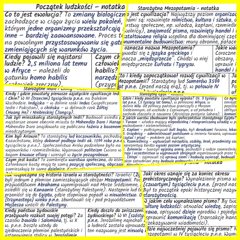 Zestaw notatek w formie pytań i odpowiedzi do zagadnień dotyczących początków ludzkości oraz powstania najstarszych kultur na Bliskim i Dalekim Wschodzie przygotowany dla klasy 5 według podstawy programowej nauczania historii w szkole podstawowej (Podstawa programowa – Historia – Szkoła podstawowa IV-VIII).