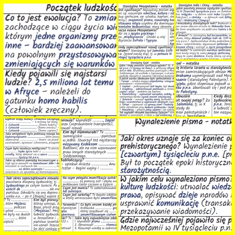 Zestaw notatek w formie pytań i odpowiedzi do zagadnień dotyczących początków ludzkości oraz powstania najstarszych kultur na Bliskim i Dalekim Wschodzie przygotowany dla klasy 5 według podstawy programowej nauczania historii w szkole podstawowej (Podstawa programowa – Historia – Szkoła podstawowa IV-VIII) oraz komplet kart pracy zawierających luki w treści wymagające uzupełnienia ustnego lub pisemnego.