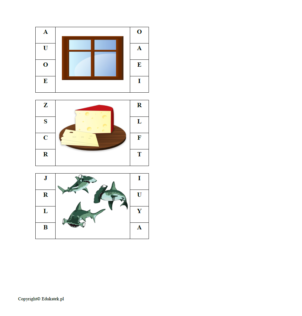 W skład zestawu wchodzi 51 obrazków do samodzielnego wydrukowania. Każda karta zawiera obrazek oraz propozycje 4 głosek wypisanych przed i za obrazkiem.