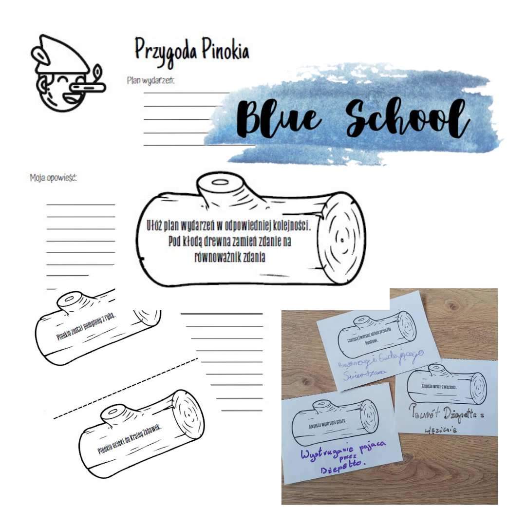Dodatkowo zamieszczona jest karta do zapisania przez ucznia wybranej przygody Pinokia (miejsce na plan wydarzeń tej przygody i jej zapis).