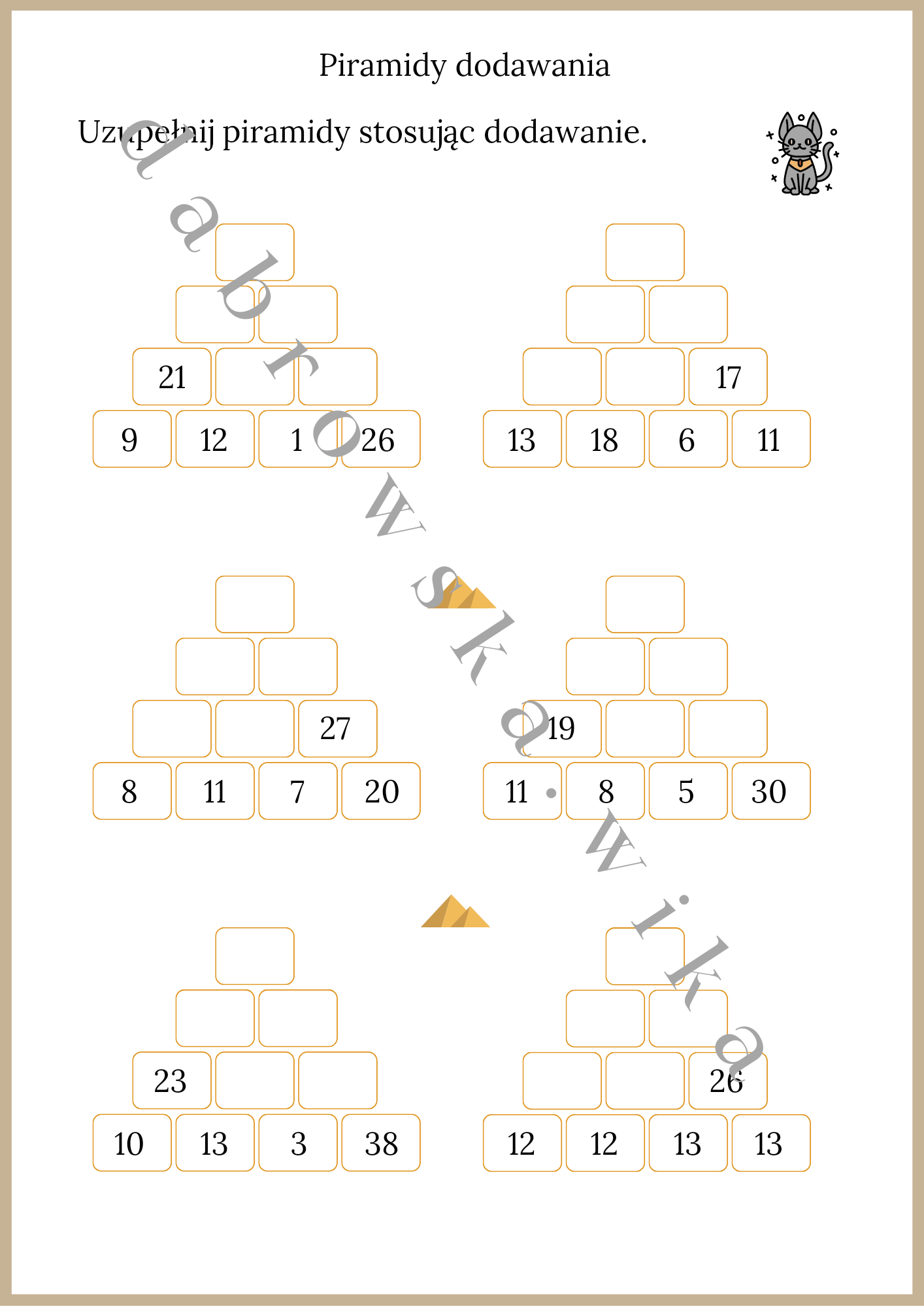Zadaniem ucznia jest uzupełnienie piramid właściwymi liczbami stosując dodawanie.