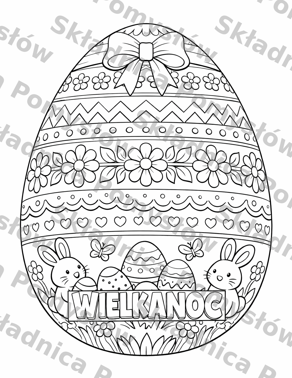 Ten materiał to dekoracyjna pisanka pełna wiosennych detali - znajdziesz tu zajączki, kwiaty, motylki, świąteczne jajeczka i duży napis „WIELKANOC”, który od razu buduje radosny, sezonowy klimat. Całość została przygotowana w 2 wariantach: jako 1 strona A4 do samodzielnego kolorowania oraz jako wersja powiększona na 4 kartkach A4, którą po złożeniu można zamienić w efektowny plakat. Razem materiał liczy 5 stron.