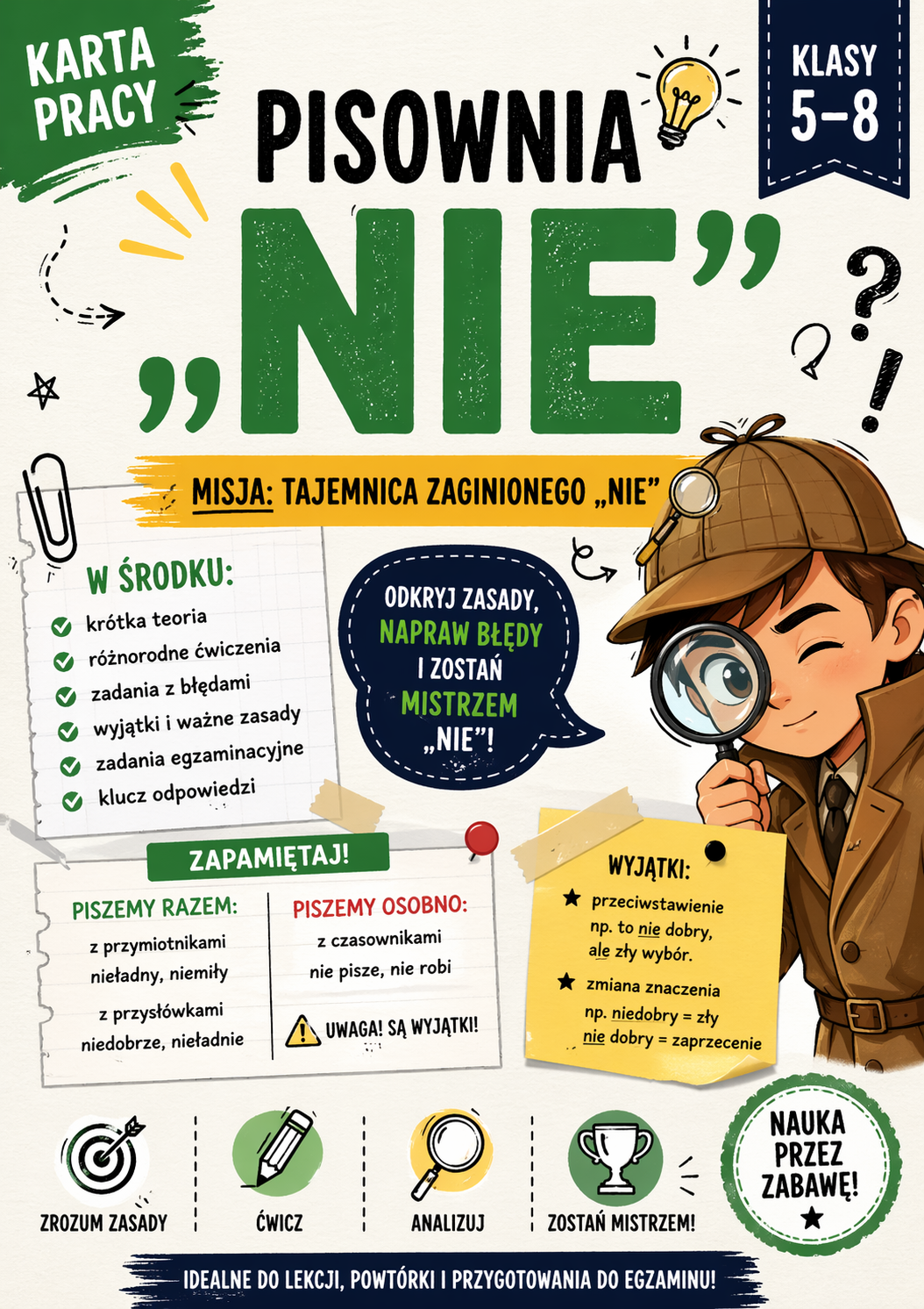 Szukasz materiału, który w prosty i skuteczny sposób wyjaśni uczniom pisownię „nie”? Ta karta pracy w formie misji „Tajemnica zaginionego ‘nie’” to gotowa lekcja, która łączy teorię z praktyką.